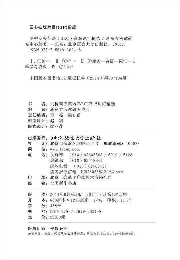 <Cambridge Business English (BEC) Дополнительный выбор словарного запаса>Ссылаясь на реальные вопросы в предыдущие годы, выберите основной бизнес-словарный запас облегченного экзамена BEC и специально разработайте 30-дневный план учебы, чтобы помочь кандидатам быстро освоить словарный запас, эффективно расширить свой словарный запас и улучшить свои результаты тестов. Приведенное объяснение подробно и точное, а метод памяти является научным и эффективным; Слова объясняются с разных точек зрения: запоминание, примеры, бизнес, координация и задание, с богатыми примерами и простыми в использовании; Небольшие веб -сайты для прослушивания и разговора и письма настроены, а словарный запас применяется к бизнес -сценариям, чтобы помочь кандидатам применить то, что они изучили, и подготовить к экзамену всесторонне. В то же время вы можете получить бесплатные английские аудиозаписи, сканировать обложку, обратную обложку и QR -код, чтобы прослушать онлайн или войти на веб -сайт, чтобы загрузить и использовать, а также учиться во время прослушивания, эффект будет удвоен.