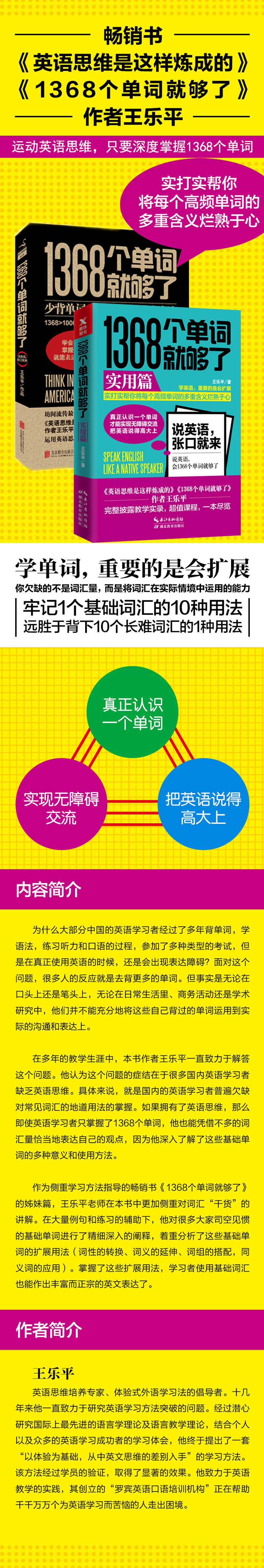 Поскольку статья сестры «1368 слов достаточно», чтобы сосредоточиться на методах обучения, учитель Ван Лепинг больше внимания уделяется словаре в этой книге“ сухой товары&Rdquo;При содействии большому количеству примеров предложений и упражнений он объяснил подробное и на глупости объяснения многих основных слов, которые являются обычным явлением, и сфокусировано на анализе использования расширения этих основных слов (преобразование слов, расширение Значение слова, применение слов группы, применение синонимов)) сущностьПосле освоения этих расширений учащиеся также могут сделать богатые и подлинные английские выражения, используя базовый словарный запас.