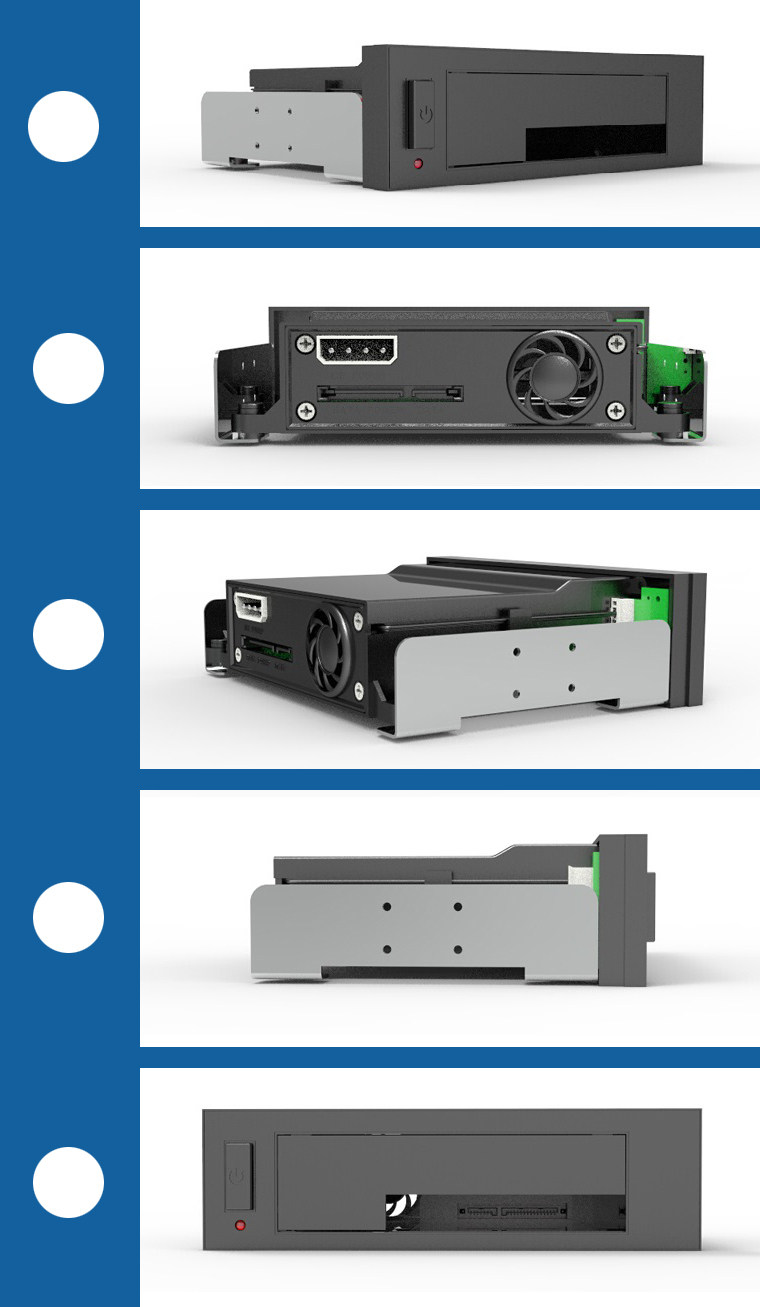 стойке, изделие очень просто установить на шасси.1bay 5.25дюймовое положение; напрямую питается от стабильного источника питания шасси и оснащен большим4PиSATA 15PДвойной интерфейс питания, совместимый с различными интерфейсами питания шасси;Это избавляет вас от необходимости беспокоиться о различных типах интерфейсов питания и проблемах с проводкой; фронтальныйLEDСветовые индикаторы позволяют легко понять динамику жесткого диска в любой момент;