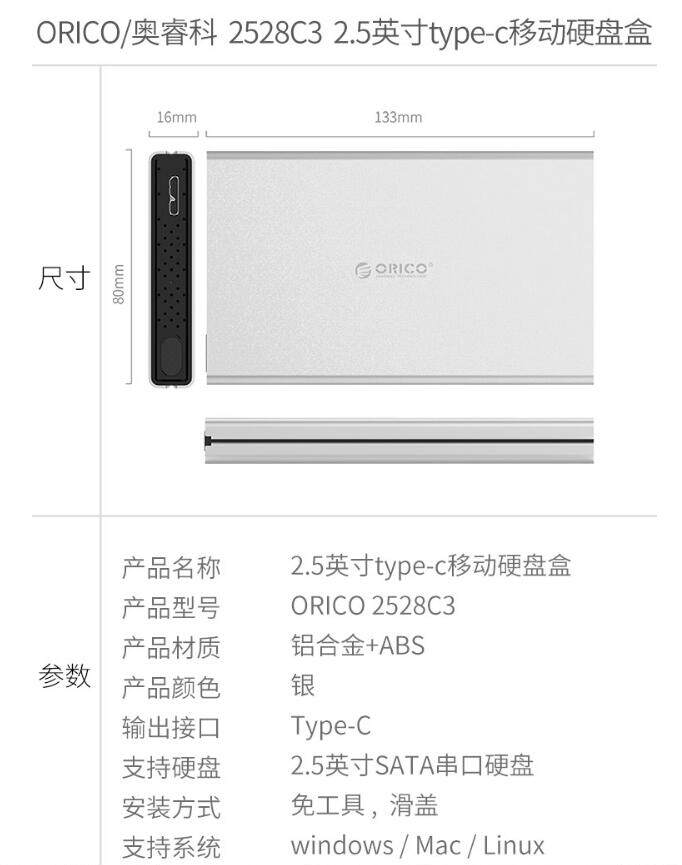 Orico 2528C3 USB3.1Type-C Мобильный жесткий диск коробка алюминиевого сплава 2,5-дюймовый серийный порт SATA