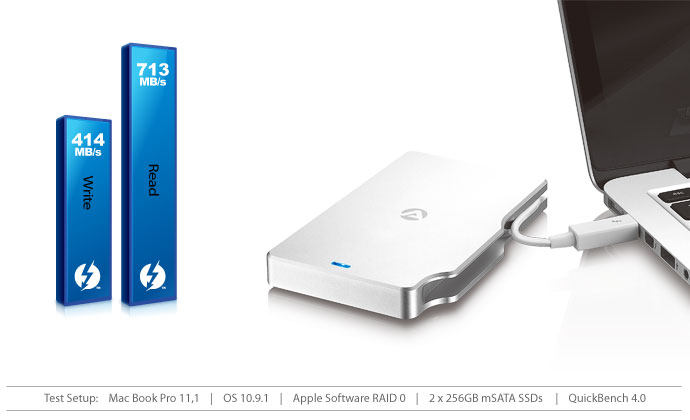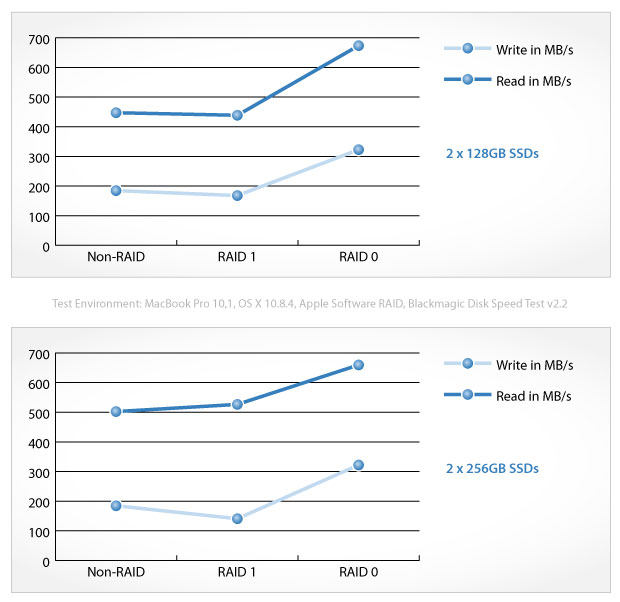 Следующие тесты - это данные, полученные путем настройки программного RAID 0 на Mac OS с программным обеспечением измерения скорости Blackmagic, только для справки.