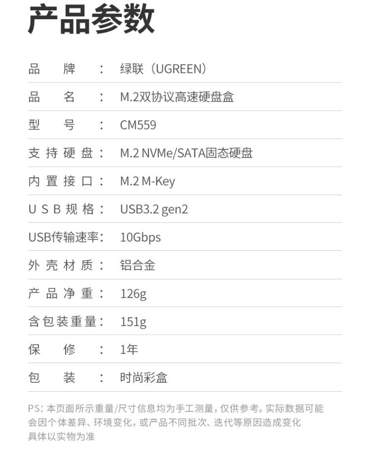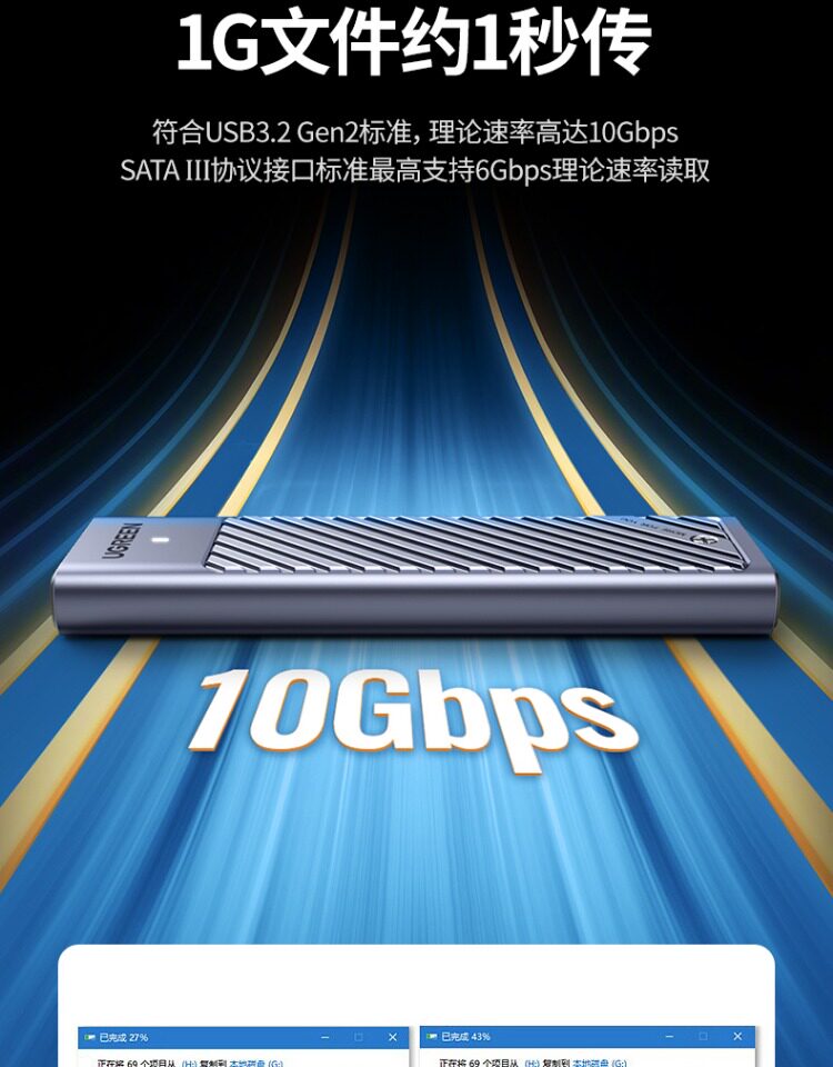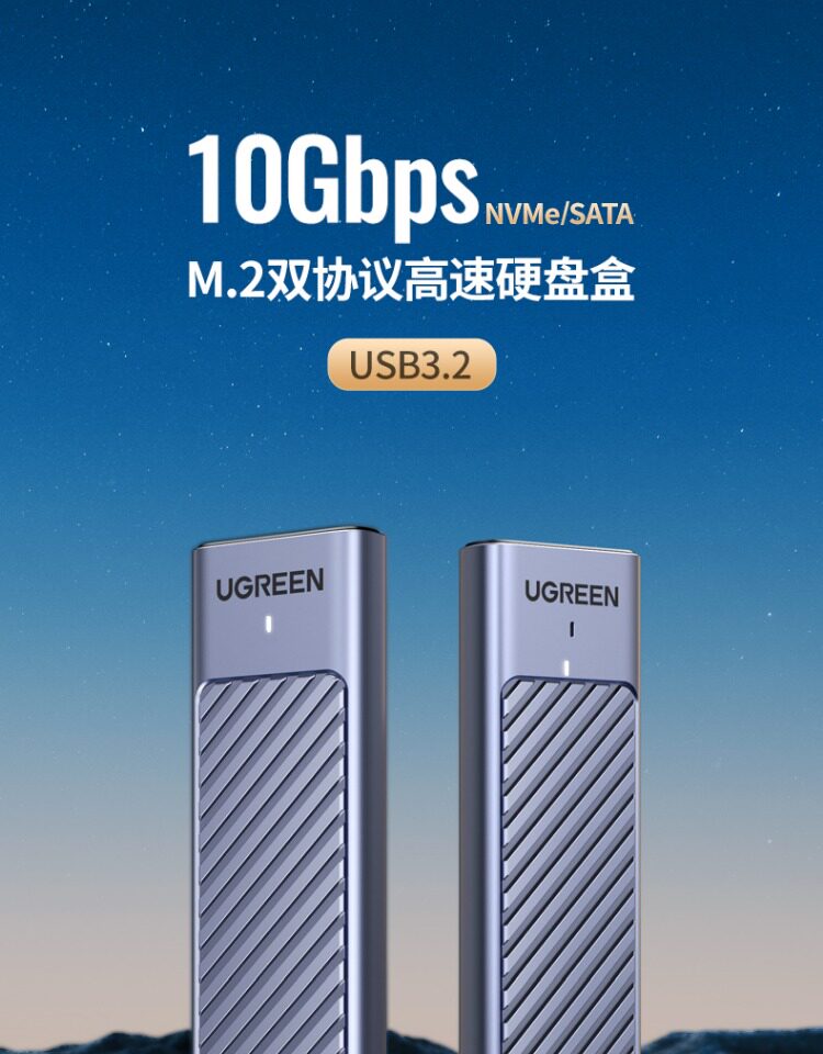 Зеленая федерация Ugreen M.2nvme/SATA Двойной протокол твердый диск коробка типа C/USB3.2 Внешнее движение