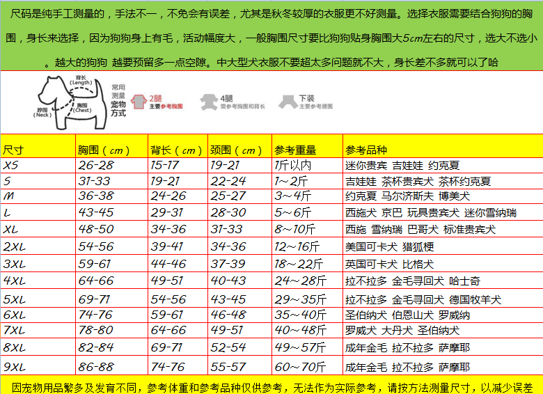 | Размер: | Xs (1-2 фунта), S (2-3 фунта), М (3-4 фунта), L (4-6 кот), XL (7-10 кот), 2xl (11-16 Catties), 3xl (16-20 кот), 4xl (21-25 кот), 5xl (25-35 Catties), 6xl (35-45 Catties), 7xl (45-55 Catties), 8xl (55-65 Catties), 9xl (65-75) |