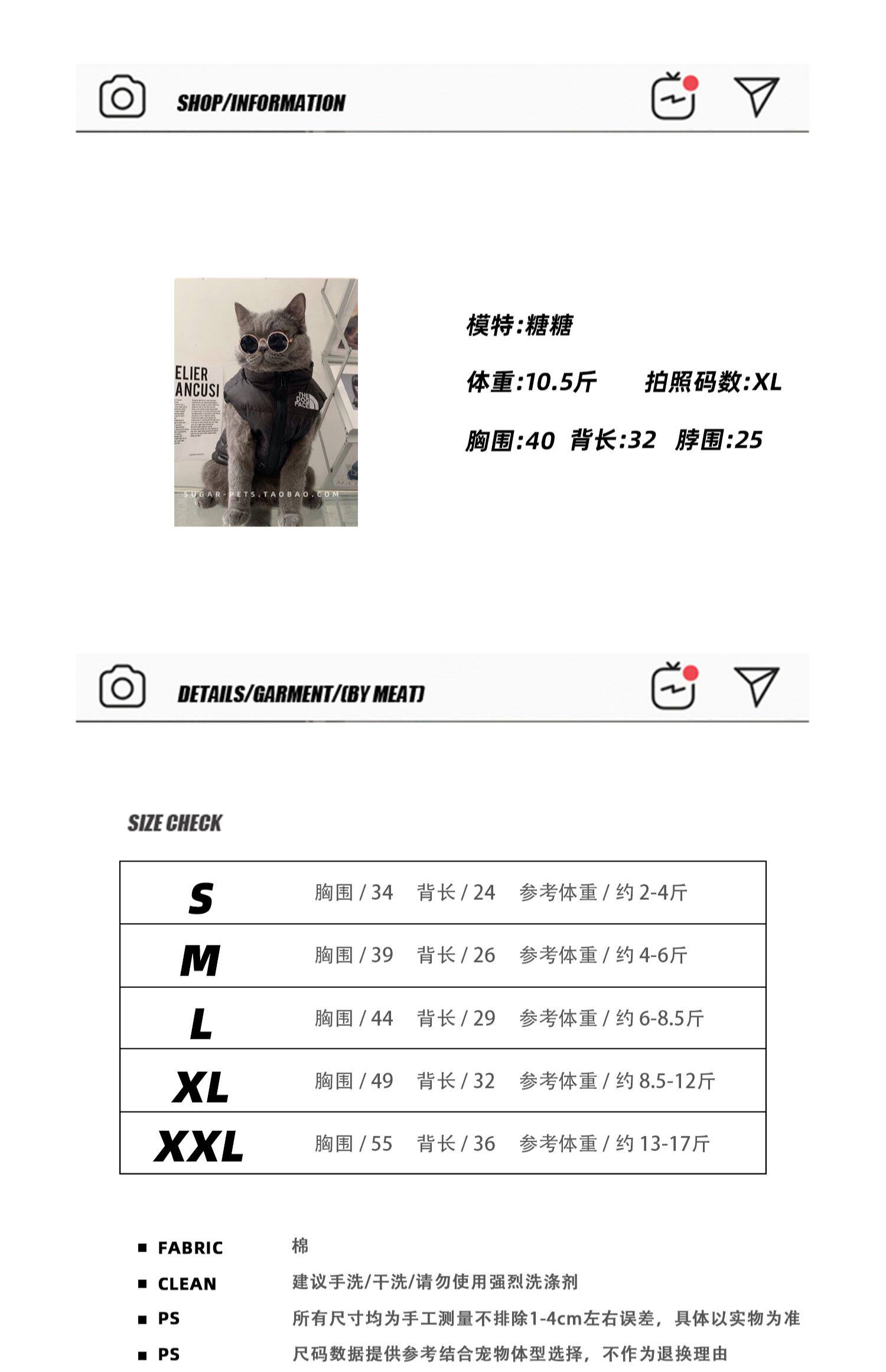 | Размер: | Рекомендации по весу только для справки, пожалуйста, обратитесь к размеру, S (акт 34 Back 24 3 3 около 2-4 Catties), М (грудь 39 назад 26 3 3 около 4-6 котла), L (грудь 44 назад 29 4 4 около 6-8,5 кот), XL (49 назад 32 ☻ ☻ 8 8), Xxl (грудь 55 назад 36 ☻ около 13-17 кот) |