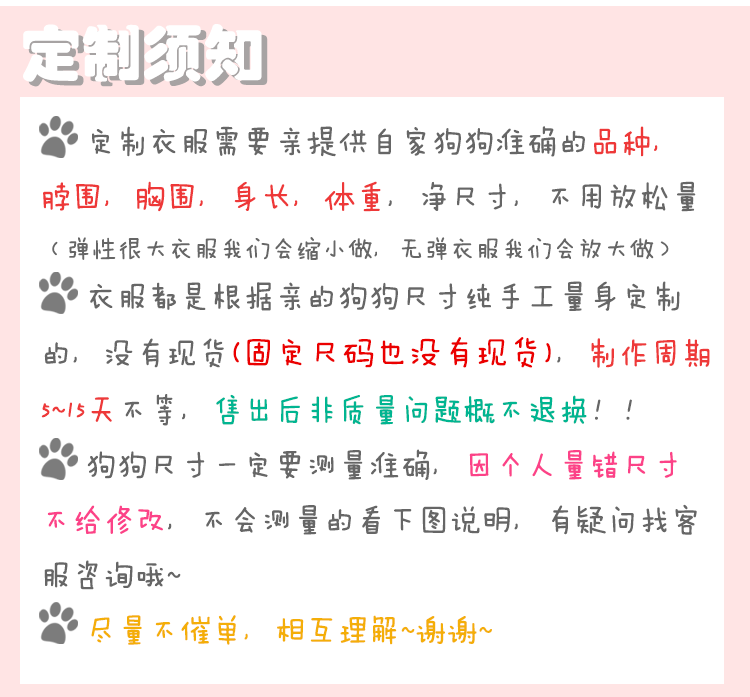 | Размер: | XXS грудь 46 шеи 30 длина 34 (8 ~ 11 Catties Teddy), Xs грудь 48 шея 32 длинная 28 (9 ~ 12 фунтов), S грудь 52 шея 36 Long 30 (13 ~ 17 Catties), М грудь 56 Шея 40 32 (18 ~ 22 кот), L Сундук 60 Шея 42 35 (23 ~ 26 кот, XL грудь 64 Шея 44 37 (27 ~ 30 Catties), 2xl грудь 64 Шея 44 45 (24 ~ 28 Catties corgi, 3xl грудь 70 шея 45 длиной 50 (29 ~ 34 Catties corgi, Индивидуальная в течение 30 фунтов (замечания измерения собаки), Индивидуальный в рамках 50 фунтов (измерение собак) |
