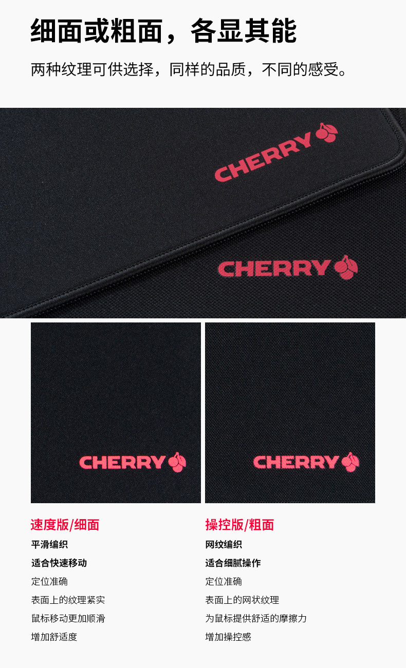 Коврики для мыши CHERRY на этот раз имеют практически такой же внешний вид, в классических черном и красном цветах.Красный ЛОГОТИП, украшенный в левом нижнем углу чисто черной ткани, чрезвычайно привлекает внимание.Поверхность коврика для мыши разделена на две версии: шероховатая и тонкая.