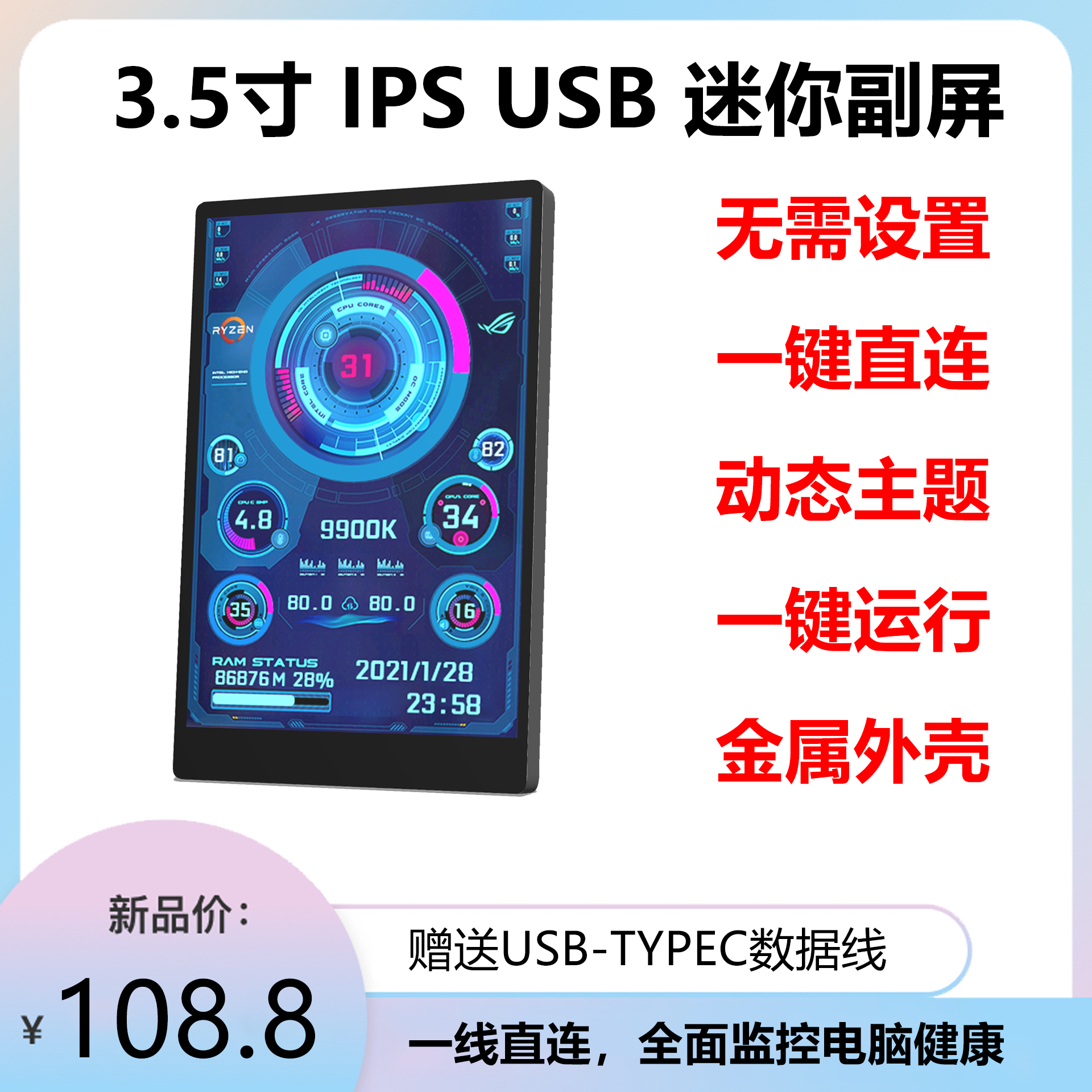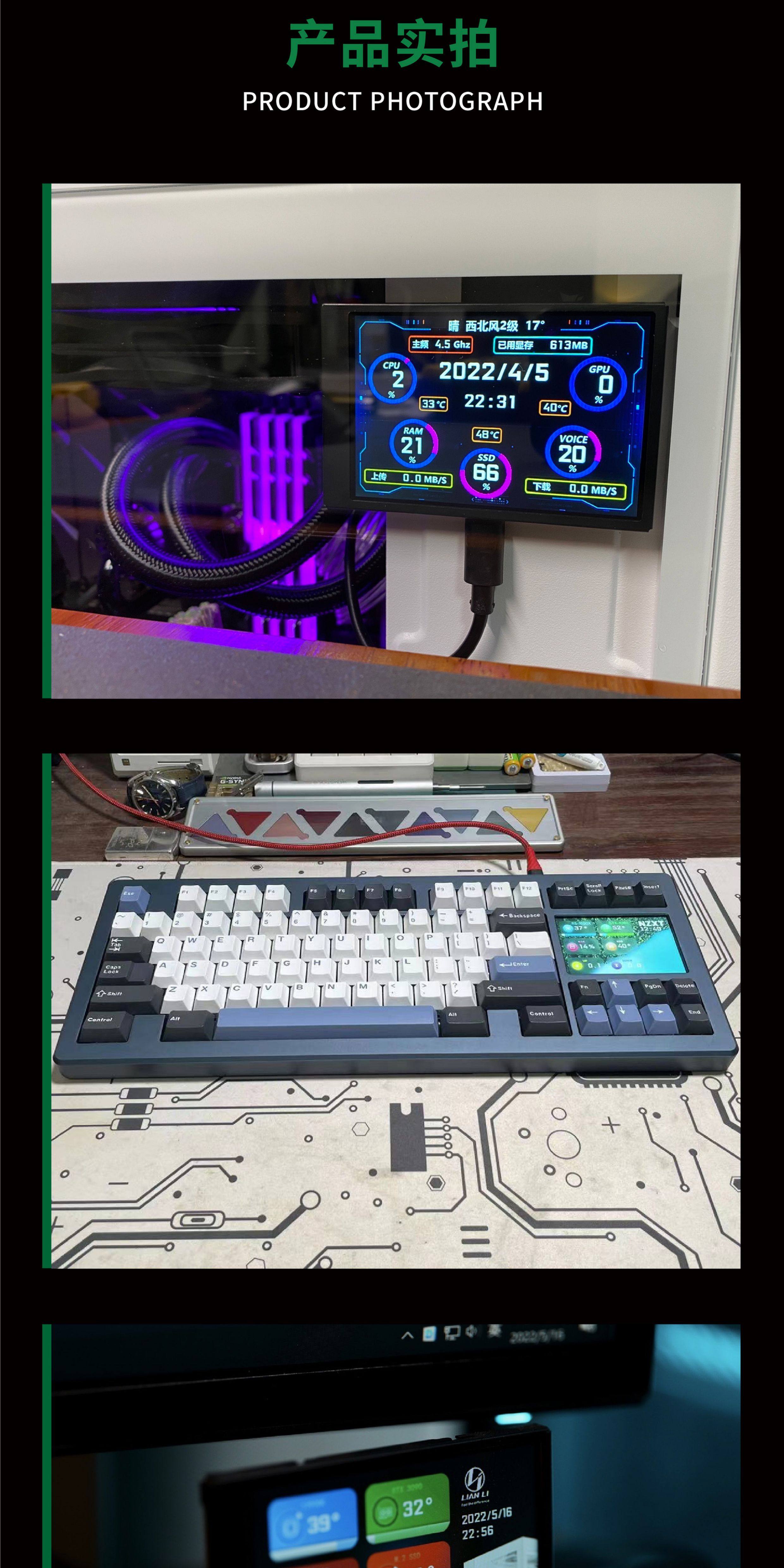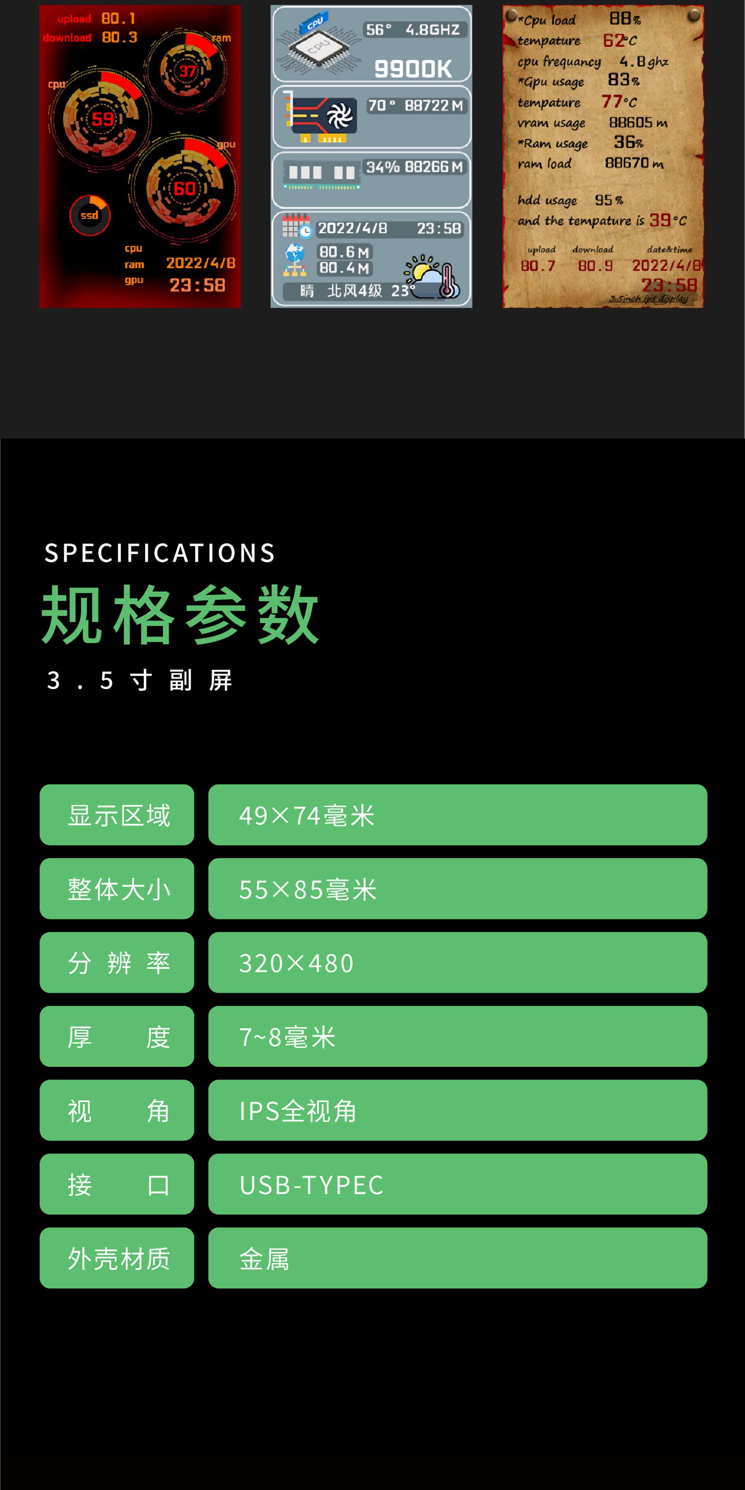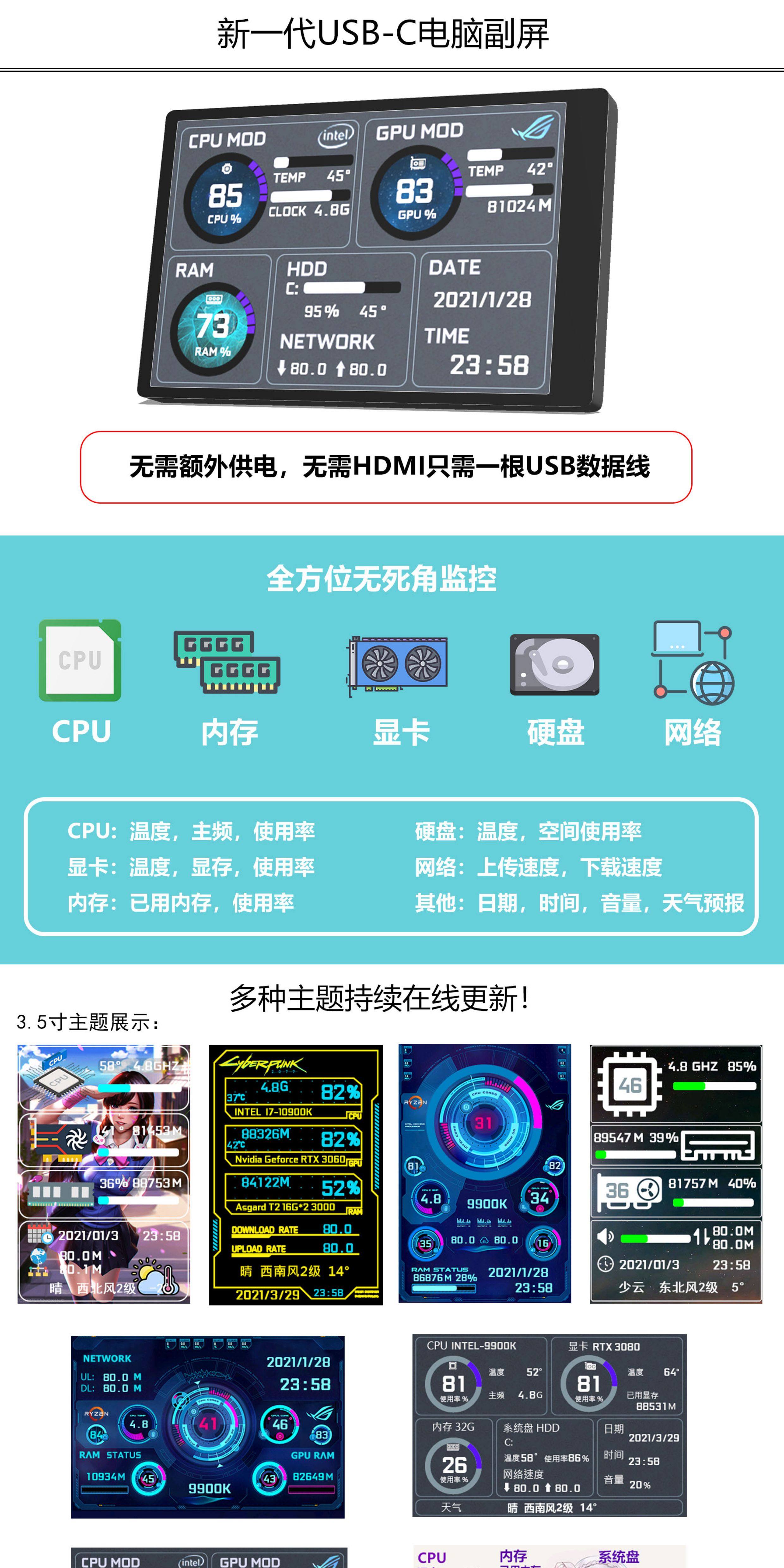 3,5-дюймовый дополнительный экран IPS TYPE-C, дополнительный экран USB для мониторинга компьютера, полностью алюминиевый материал, без AIDA64, для настольных компьютеров