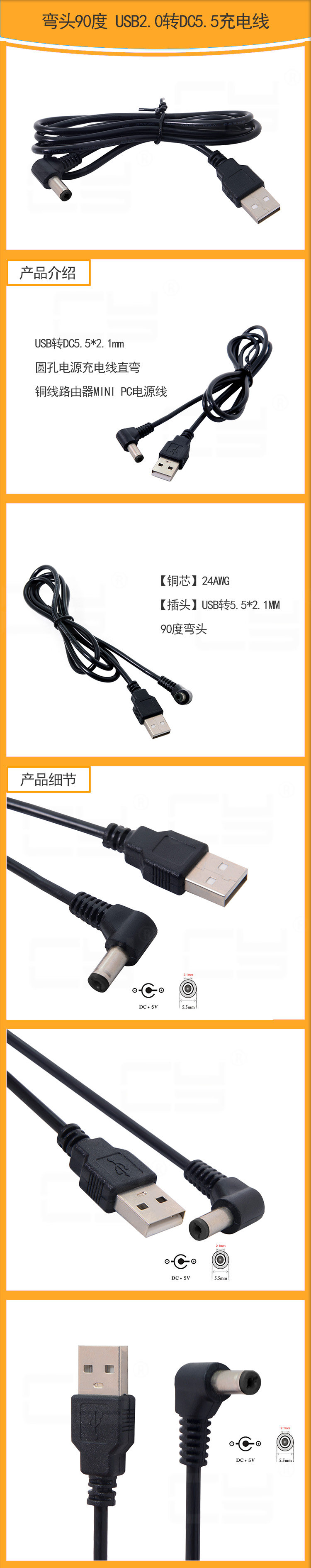 Колон 90 градусов USB до DC5,5*2,1 мм медная линия Mini PC Power Cable U2-184-RI