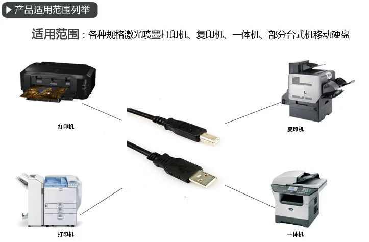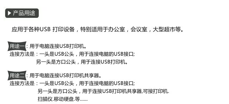 Использует 1: для компьютерного подключения USB -принтера.Метод соединения: один - это USB -человек, который используется для подключения интерфейса USB к компьютеру; другой конец - мужская голова Fangkou для подключения USB -принтера.