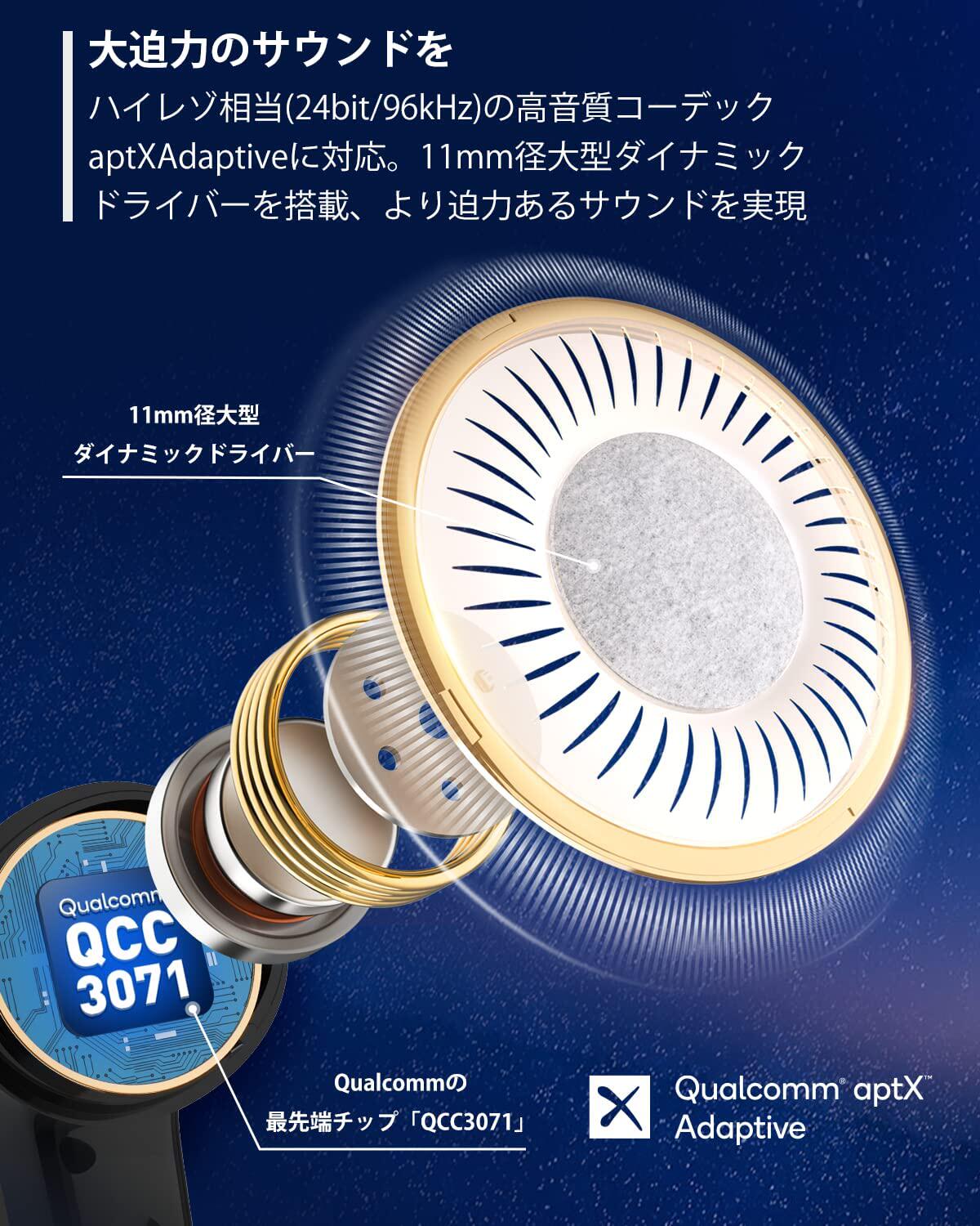 [Золотая награда VGP2023?Награда за планирование 9–9/Самый передовой чип Qualcomm QCC3071] Выиграл премию Audio Visual Award Золотая награда VGP2023?Награда за планирование 9–9!Использование самых передовых чипов от Qualcomm“QCC3071”, поддерживает aptX Adaptive, высококачественный кодек, эквивалентный высокому разрешению (24 бит/96 кГц), и поддерживает Bluetooth 5.3 для обеспечения более стабильного подключения и высококачественного звука.aptX Adaptive может автоматически регулировать битрейт в соответствии с условиями мониторинга и обеспечивать оптимальное воспроизведение музыки в зависимости от ситуации.Оснащенный шерстяной динамической отверткой диаметром 11 мм, он воспроизводит хорошо сбалансированные звуки: от мощных басов до плавных средних и высоких частот, обеспечивая звучание, близкое к оригиналу.Кроме того, запланирована поддержка LE Audio (LC3) (требуется смартфон с поддержкой LE Audio).