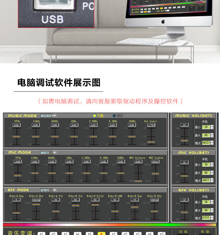 ● Музыка и микрофонные тона регулируются с помощью семи -сегментных балансировщиков, а точки с низкой частотой могут быть скорректированы