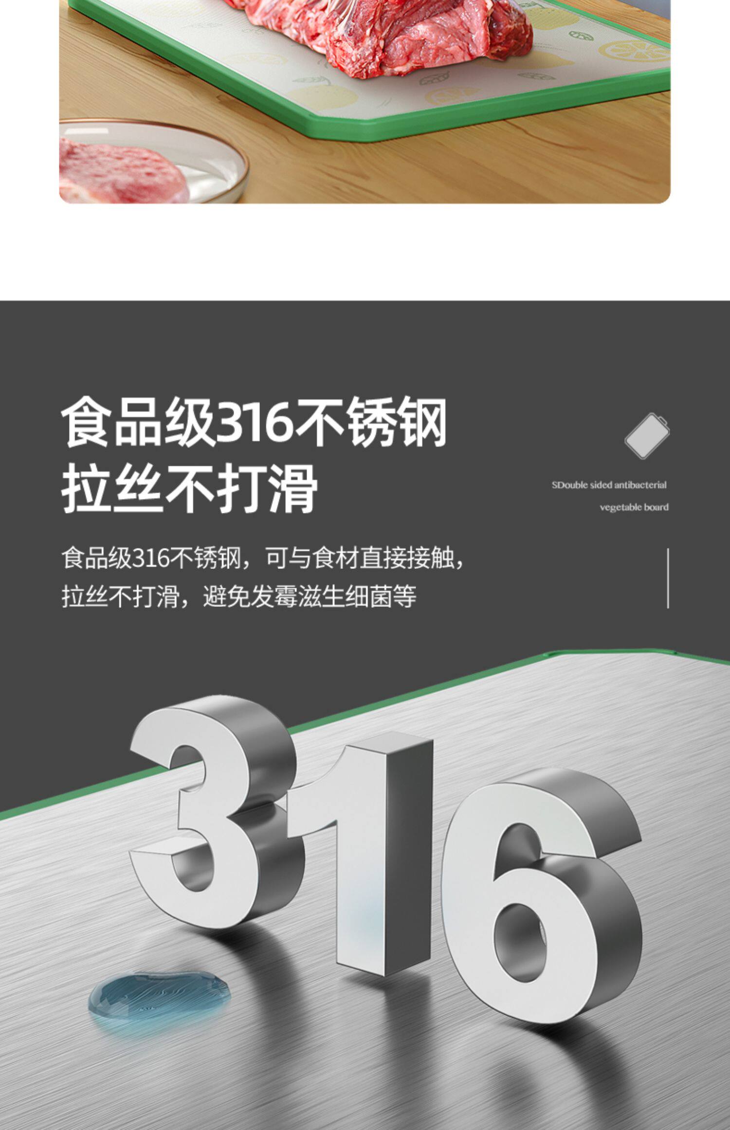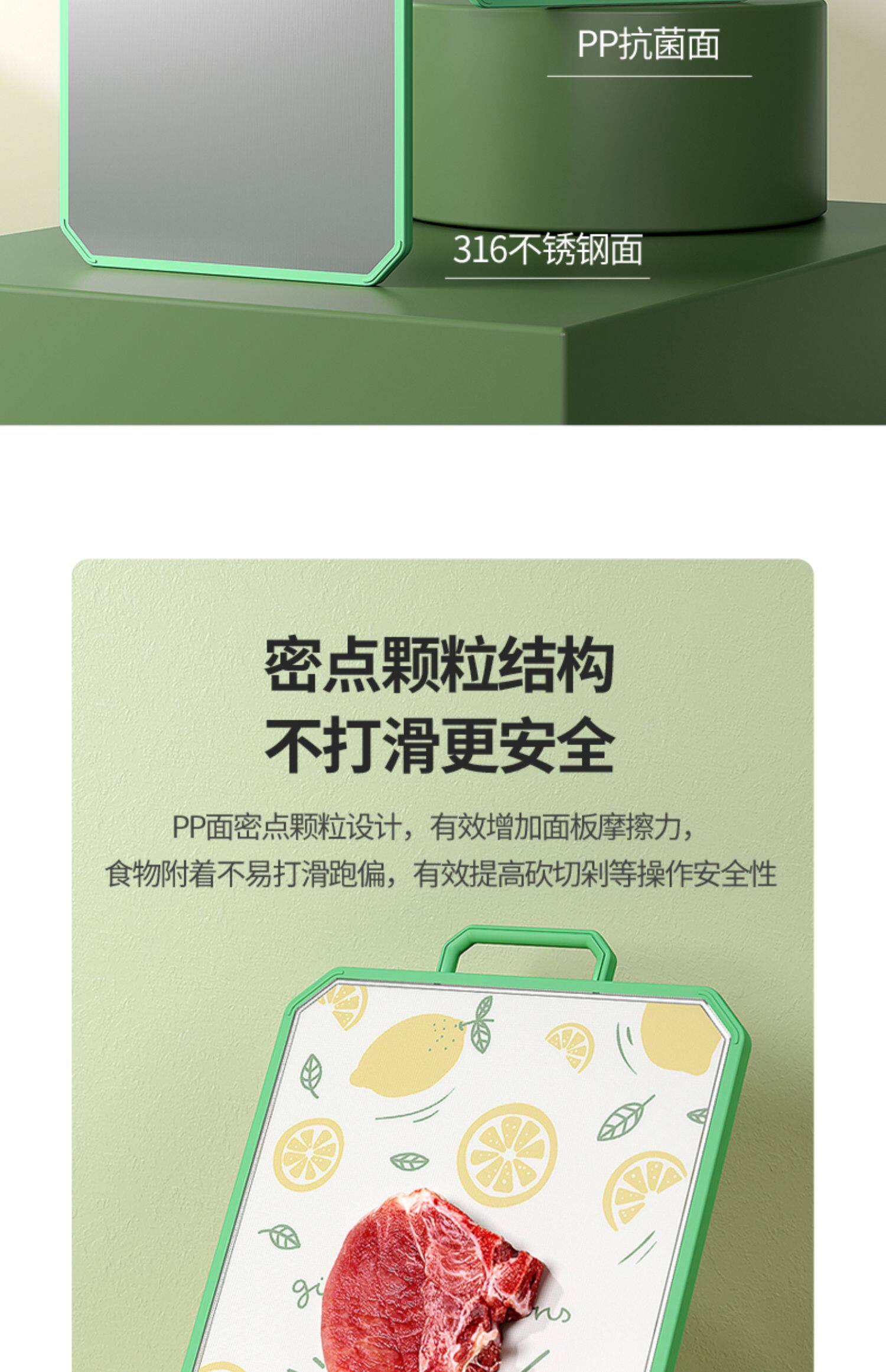 - [Флагманская модель] 316 Двойная антибактериальная 99% нержавеющая сталь + PP Двухсторонняя режущая доска (зеленый цвет с большим фруктом)