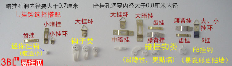 | A016A | 0.3 | [只可以搭配普通的铁钉,所以建议买A018A、或者A019A这个型号的挂件] | [相框、画框、十字绣挂件,要拧螺丝固定,搭配无痕钉使用] | |