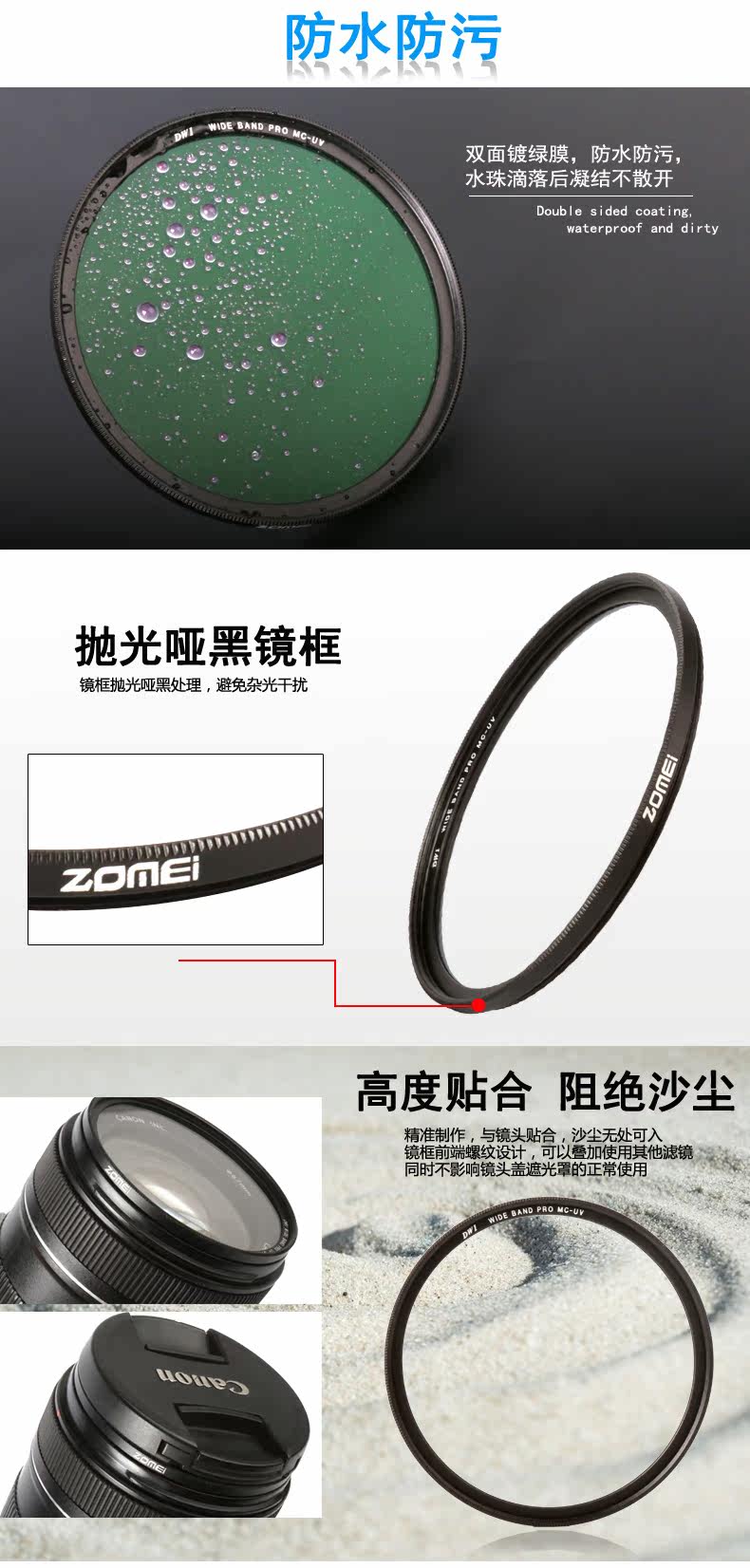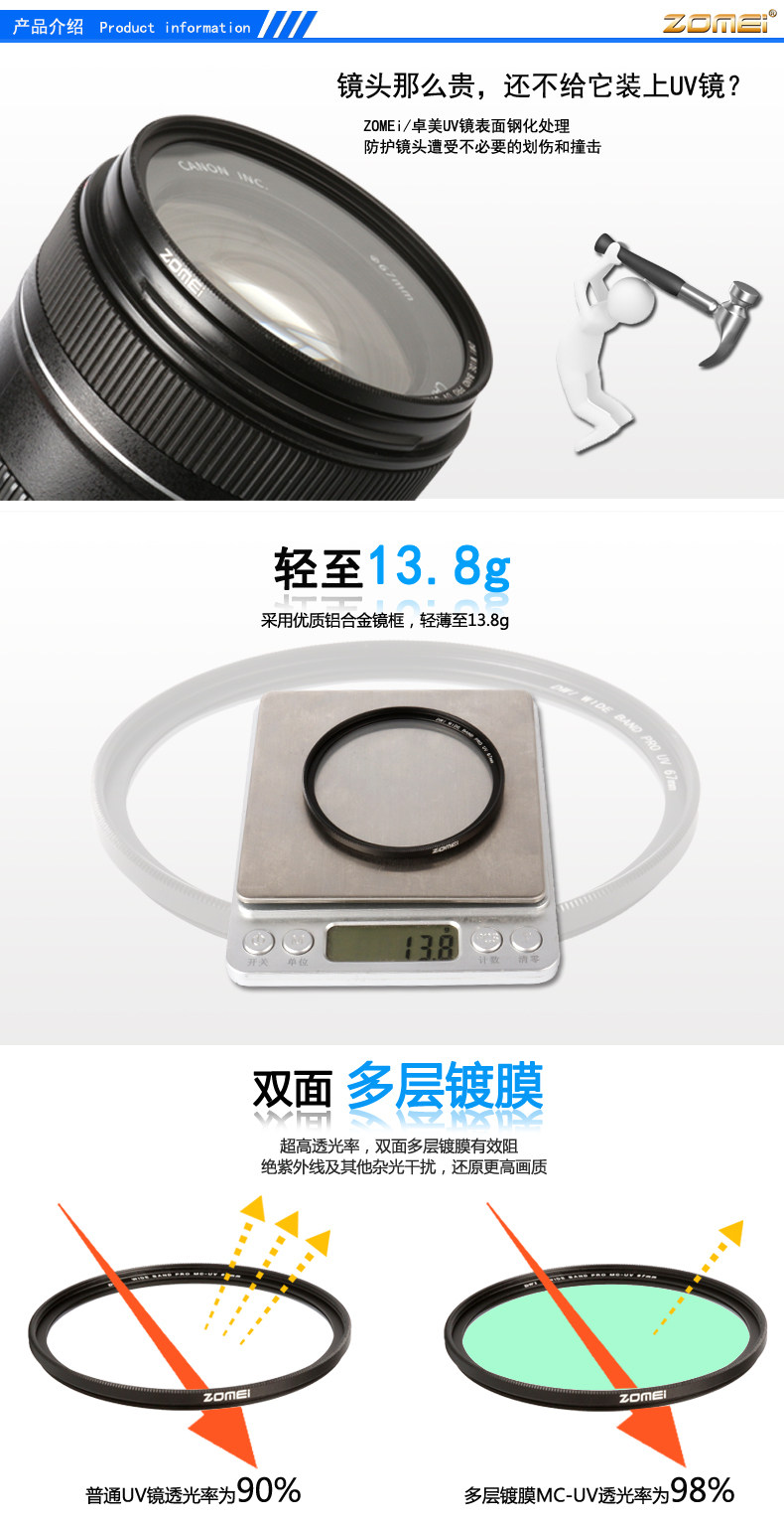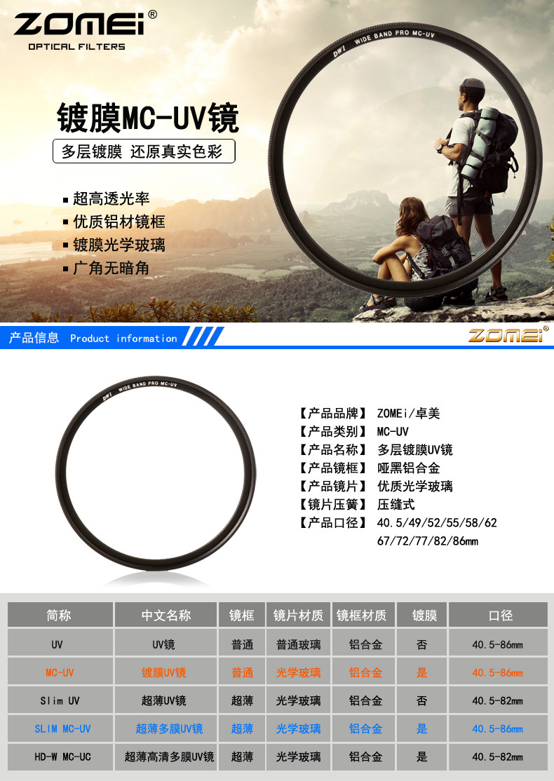 Ультратонкий MV-UV:Высококачественный оптический стеклянный материал, 3,0 -миллиметровый ультра -тсин -алюминиевый зеркальный рамка тупое черная полировка, двойная 18 слоев зеленой пленки, световая пропускание 99,2%, в то же время водонепроницаемое масло и анти -точко Углы без темных углов, телеобъектив нет взгляда!