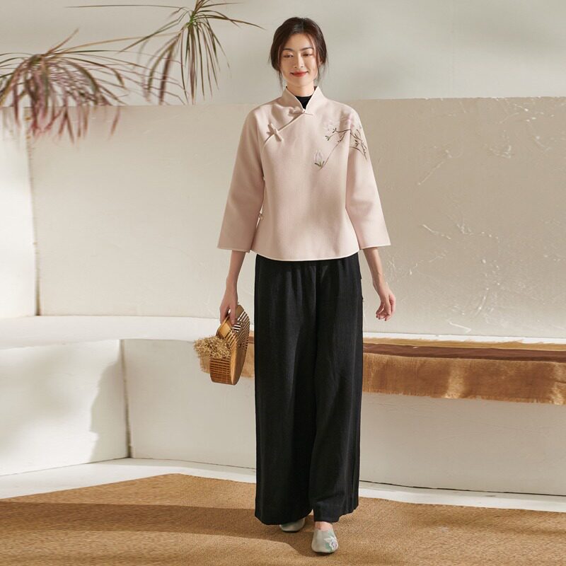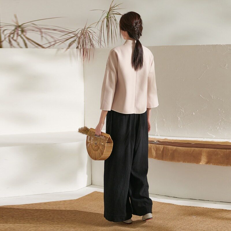 | Цвет: | 【Одиночный верх】 абрикосовый цвет, Абрикосовый комплект, черные штаны, из хлопка и льна |