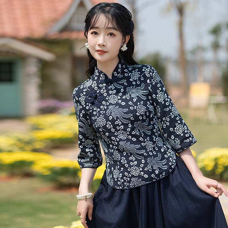 Сине-белое ципао, ханьфу, этнический комплект, большой размер, китайский стиль, из хлопка и льна, этнический стиль