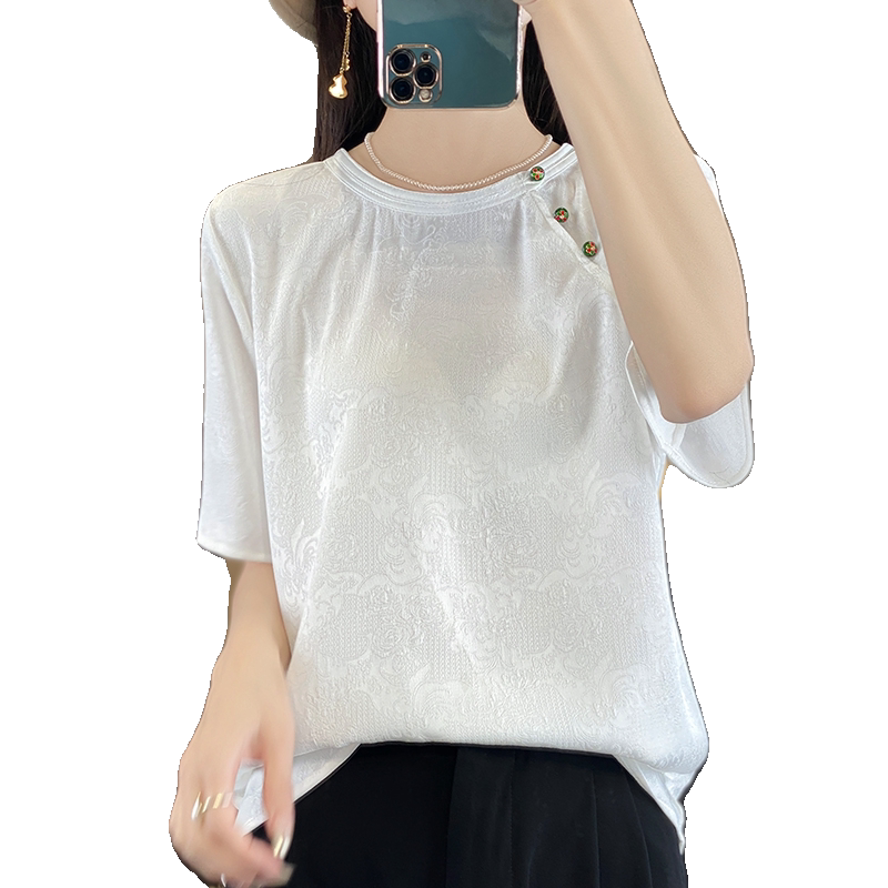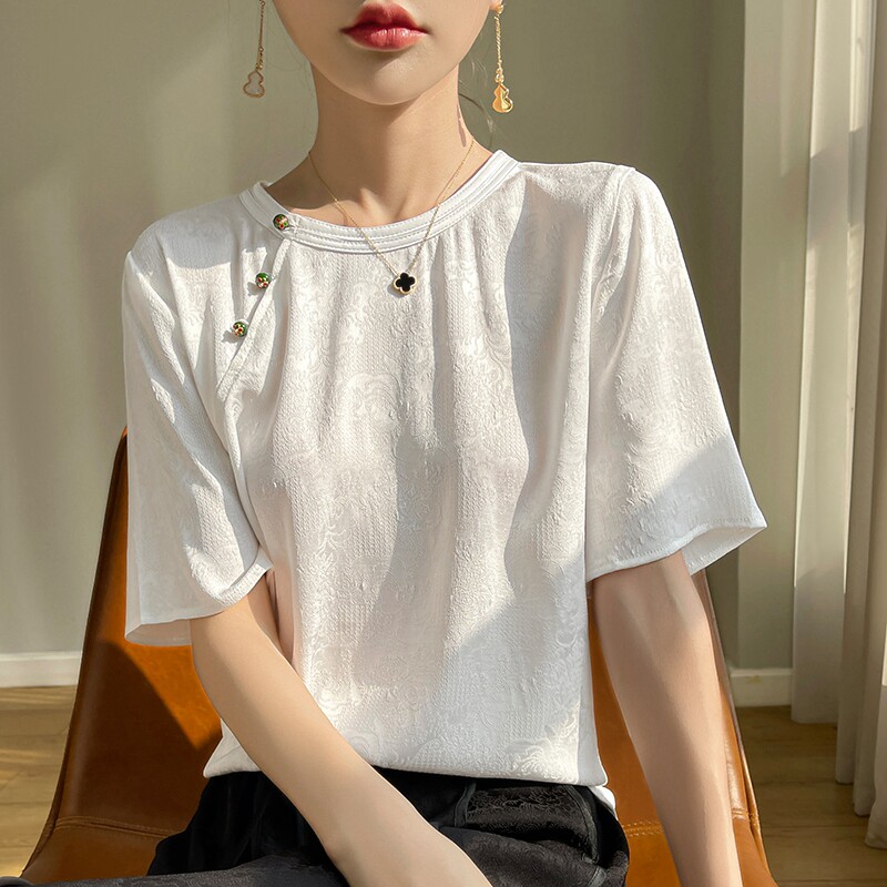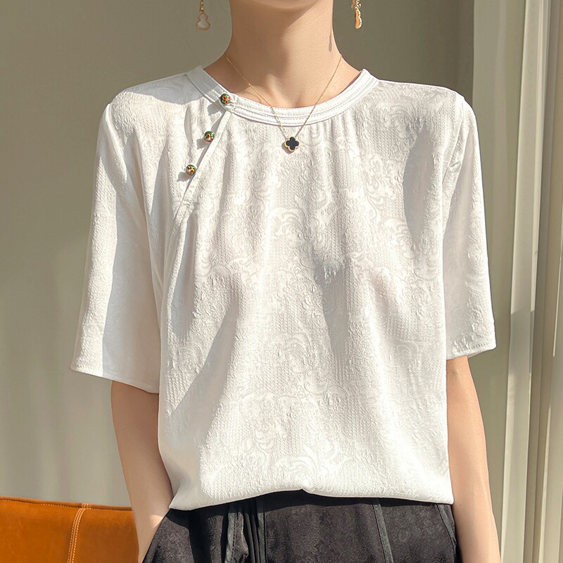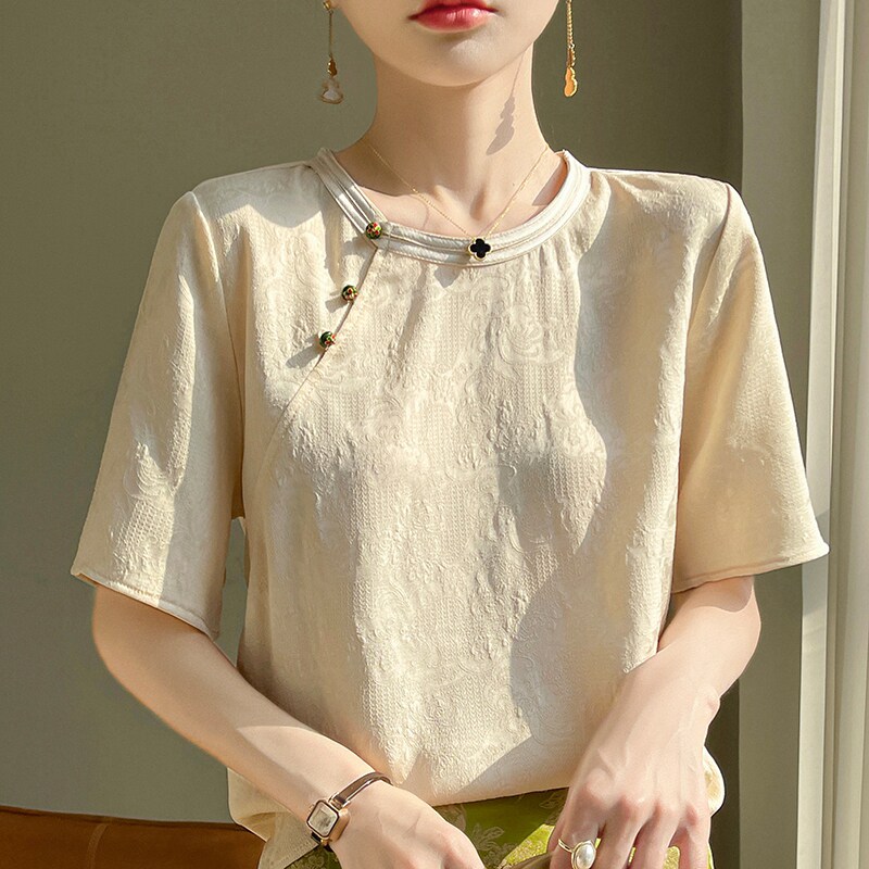 Новый китайский стиль с короткими рукавами женский рост 2024 Новый летний летний рыхлый круглый атласная рубашка из жаккарда. Уксусная кислота