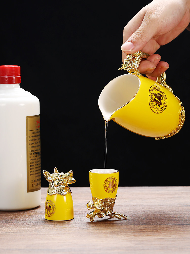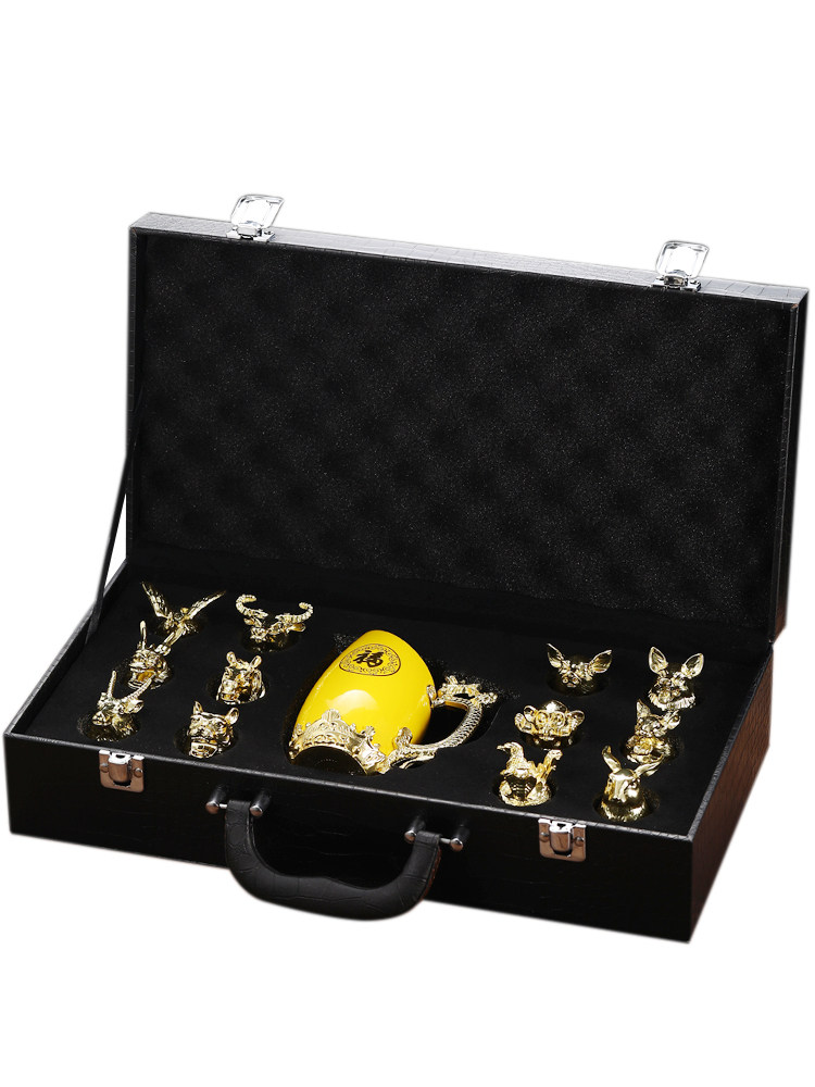 - [尊贵黄 陶瓷12生肖杯+分酒器+高档皮箱]