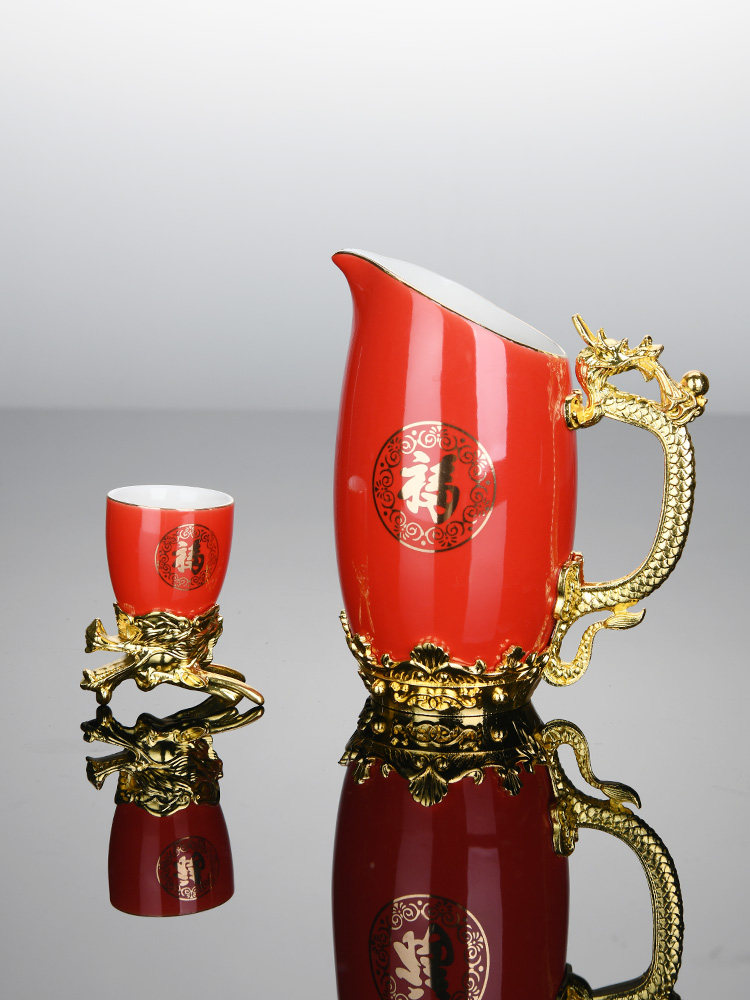 - [中国红 陶瓷12生肖杯+龙凤分酒器+竹木托盘+礼盒礼袋]