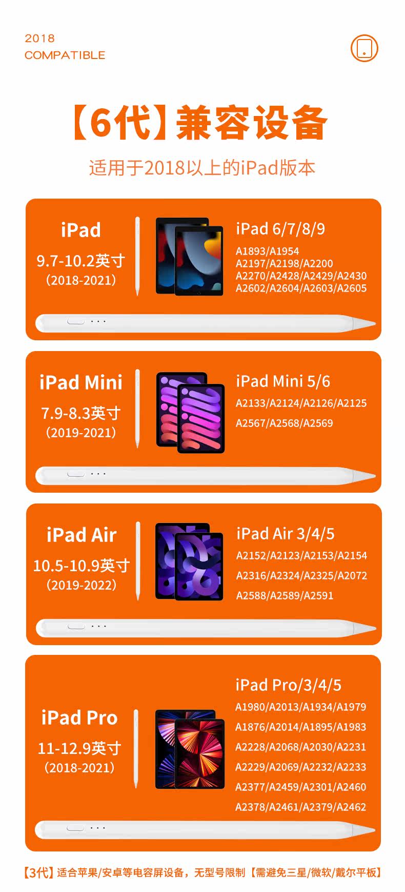 | Цвет: | 3 -е поколение - универсальная модель таблеток - без пропускания прикосновения (адаптировано ко всем основным таблеткам ~ обычная быстрая зарядка), 6 -го поколения - модель Apple iPad - AntiS -Miss Touch (адаптирована к серии 2018 или выше ~ быстрее зарядки) |