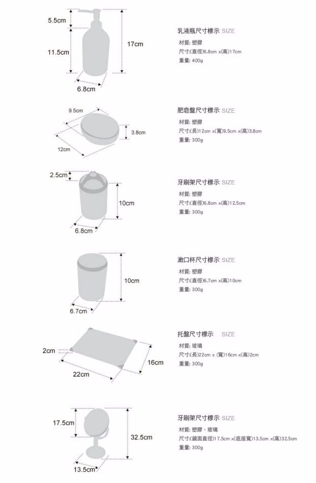| Цвет: | Бутылка лосьона 585383, Держатель зубной щетки 585390, Кубок ртания 585406, Лоток для мыла 585413, Макияж зеркало 585284, Поддон 585420 |
