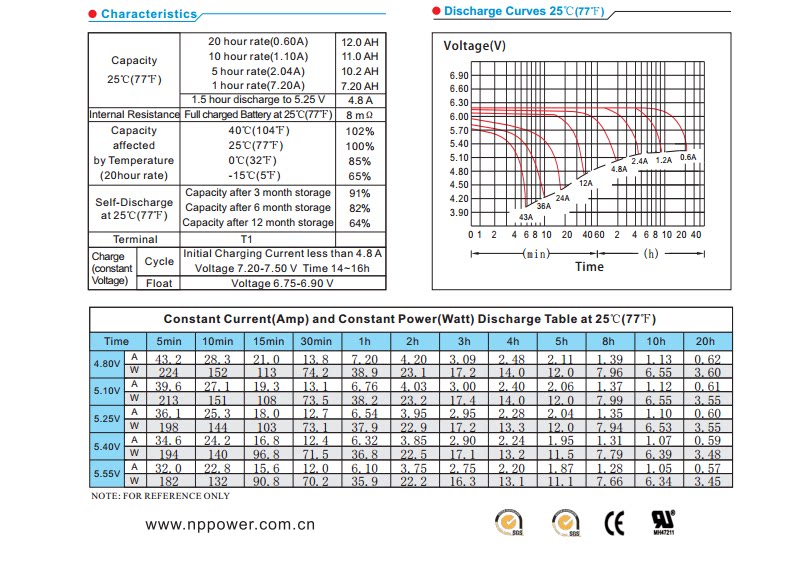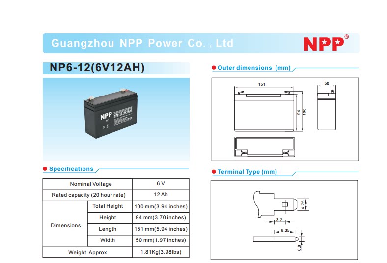 NPP Оригинальный автомобильный аккумулятор, NP6-12, 6V12AH, 12AH