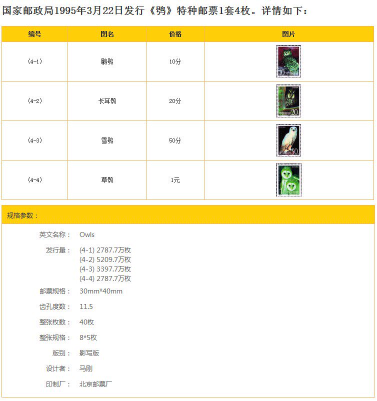 Сова, широко известная как моя страна“ сова&Rdquo;, является общим термином для птиц, порядок порядка совы, около 130 видов, и в основном является ночным хищником.Это эксперт по ловке мыши и лесной рейнджер. Его сбалансированная роль и вклад в людей в экологическую среду животных в естественной биосфере являются значительными.Этот вид полезной птицы должен быть защищен людьми, и наша страна назвала ее как национальное ключевое животное национального ключа.Чтобы повысить осведомленность людей о защите, Министерство постов и телекоммуникаций решило выбрать четырех представительных видов из 26 видов совы в моей стране, а г -н Ма Ганг Центральной академии изобразительных искусств использовал передовые методы рисования компьютера для разработки этого набора марок.