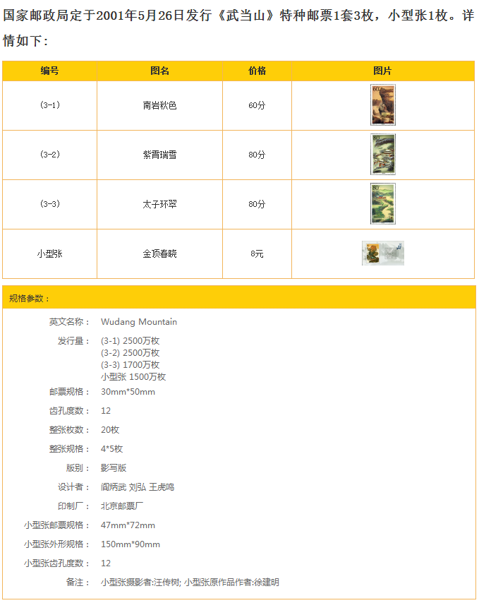 [Bole Post Agency] 2001-8 Mountain Package Wudang New China Mamps