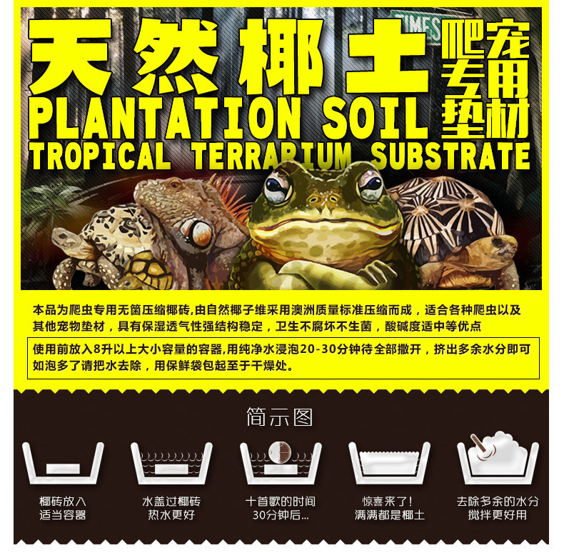 Этот продукт посвящен повторной кокосовой плиткам для рептилий. Он сжимается по австралийским стандартам качества натурального кокосового вита. Он подходит для различных рептилий и других животных.