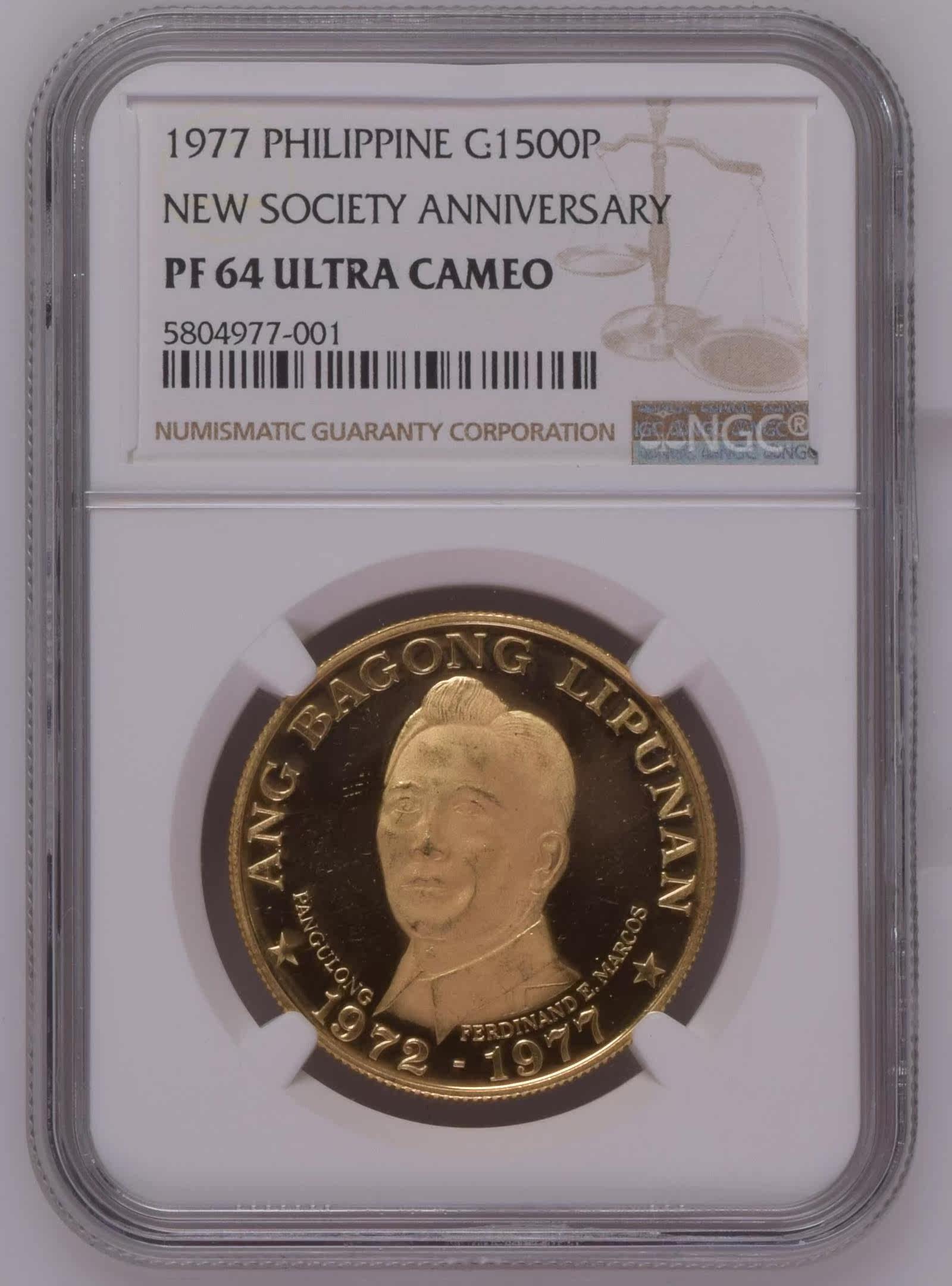 •Краткое введение:5-летие Филиппинского нового общества.Пруф-золотая монета.Рейтинг NGC PF64UC баллов.