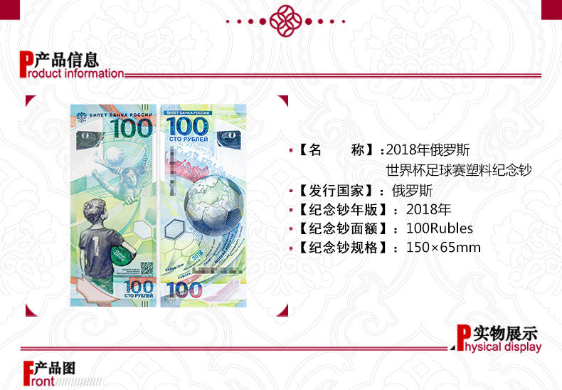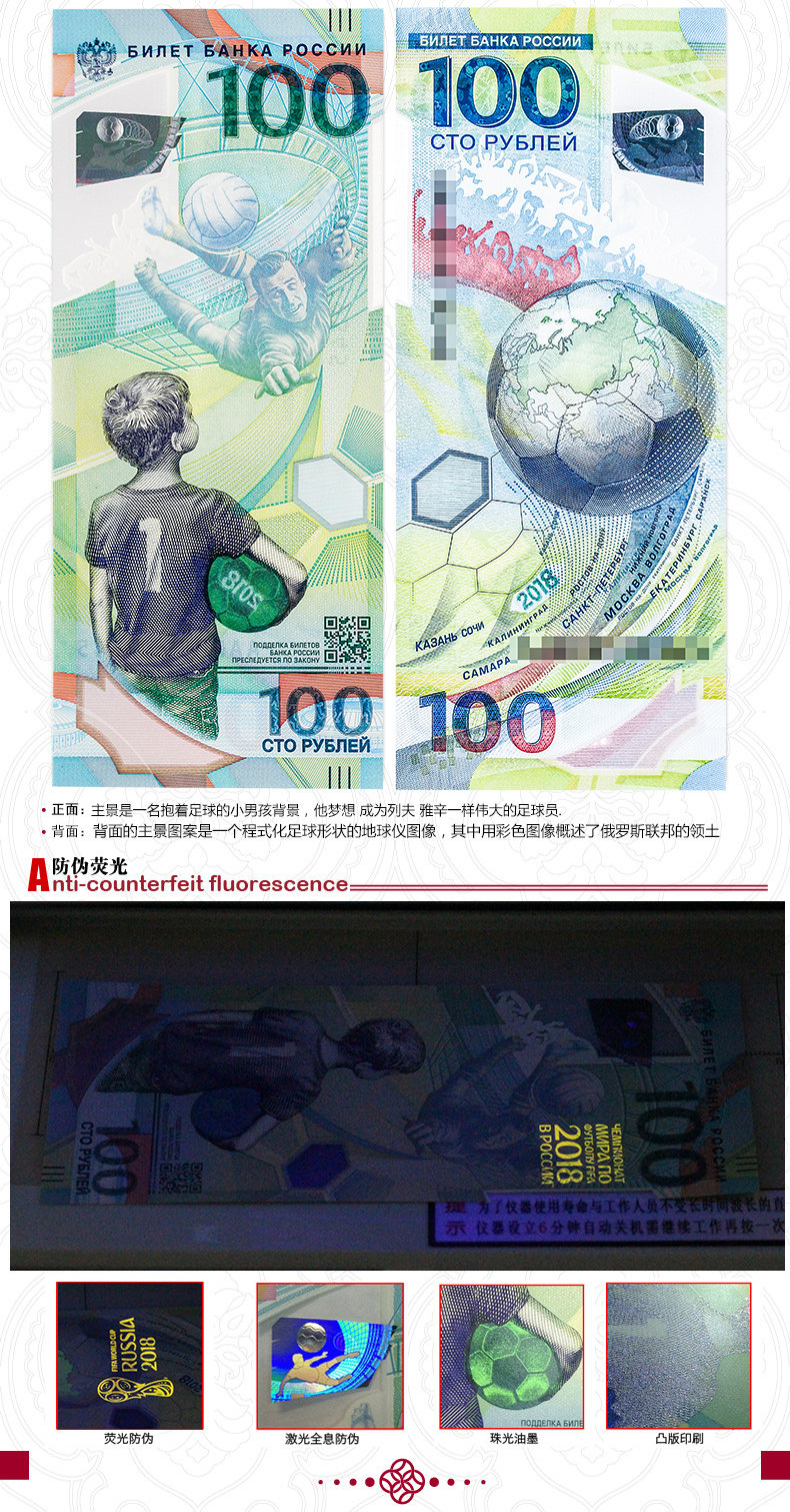 Дизайн этой памятной банкноты уникален.Положительно выражено наследство духа футбола: маленький русский мальчик держит футбол и мечтает стать лефу·Yaxin - отличный футболист.Удержание·Лев Яшин (1929-1990) был провозглашен как 20-й век*jiajiamen и выиграл европейскую премию «Золотой глобус».Он накачивал 150 штрафов в своей футбольной карьере.В нижней части фронта напечатан двухмерный код, напечатанный, и вы можете посетить официальный веб -сайт Российского центрального банка, чтобы проверить анти -сочетание характеристик памятных банкнот.