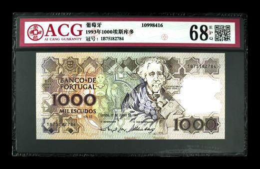 Aizang Authoritative Grading Company (ACG), новое качество GEM UNC, банкноты с оценкой 68 баллов, редкая бумага с высокими оценками EPQ, португальские банкноты старой версии 1993 года, номинальная стоимость 1000 эскудо.