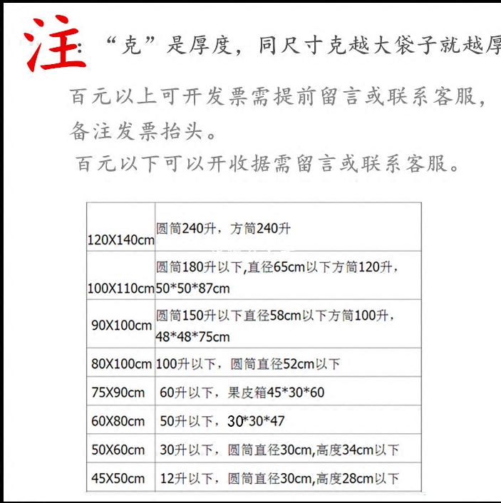 Метод размеров: например, 100*110 см мешка для мусора относится к ширине 100 см после складывания мешка для мусора.Для получения подробной информации, пожалуйста, проконсультируйтесь с обслуживанием клиентов! Спецификация: нормальный диапазон ошибок в 1-2 см.