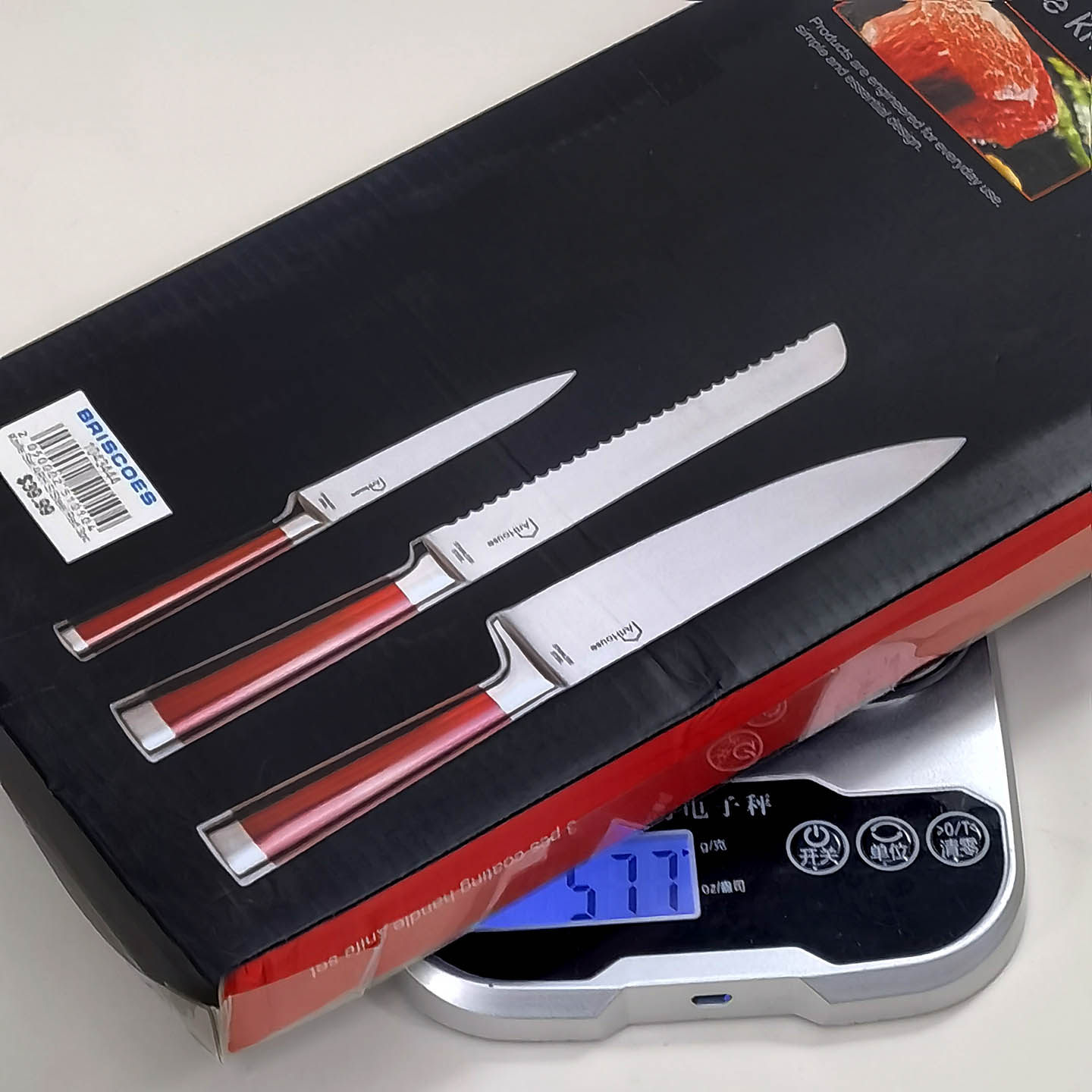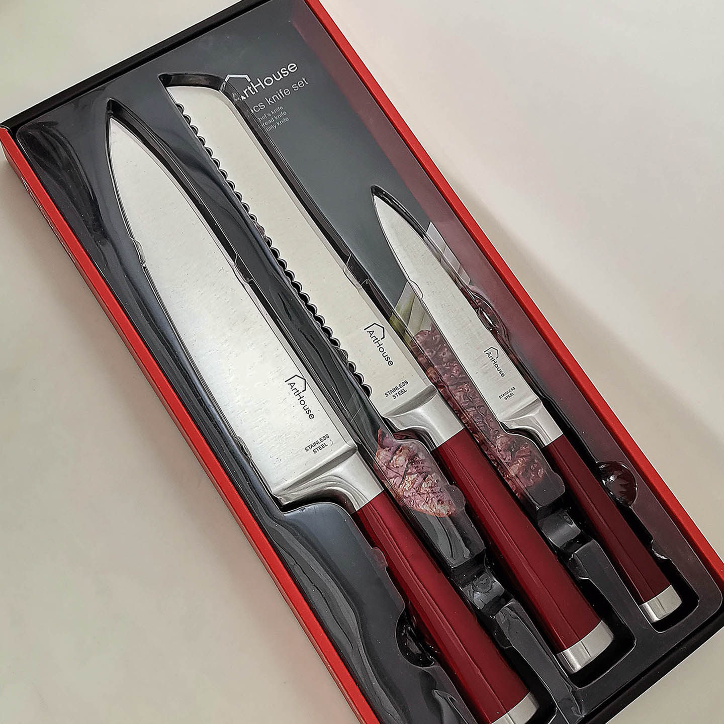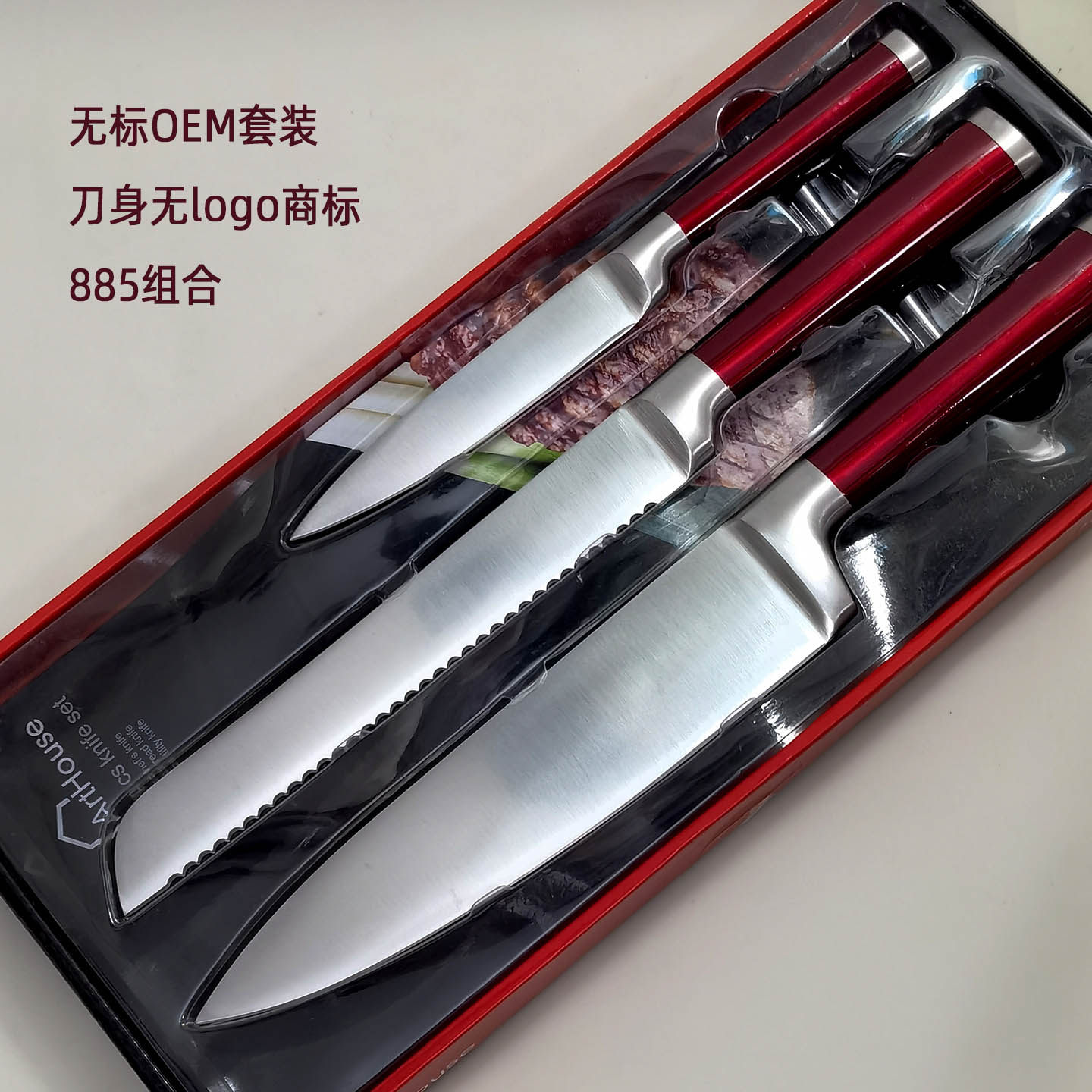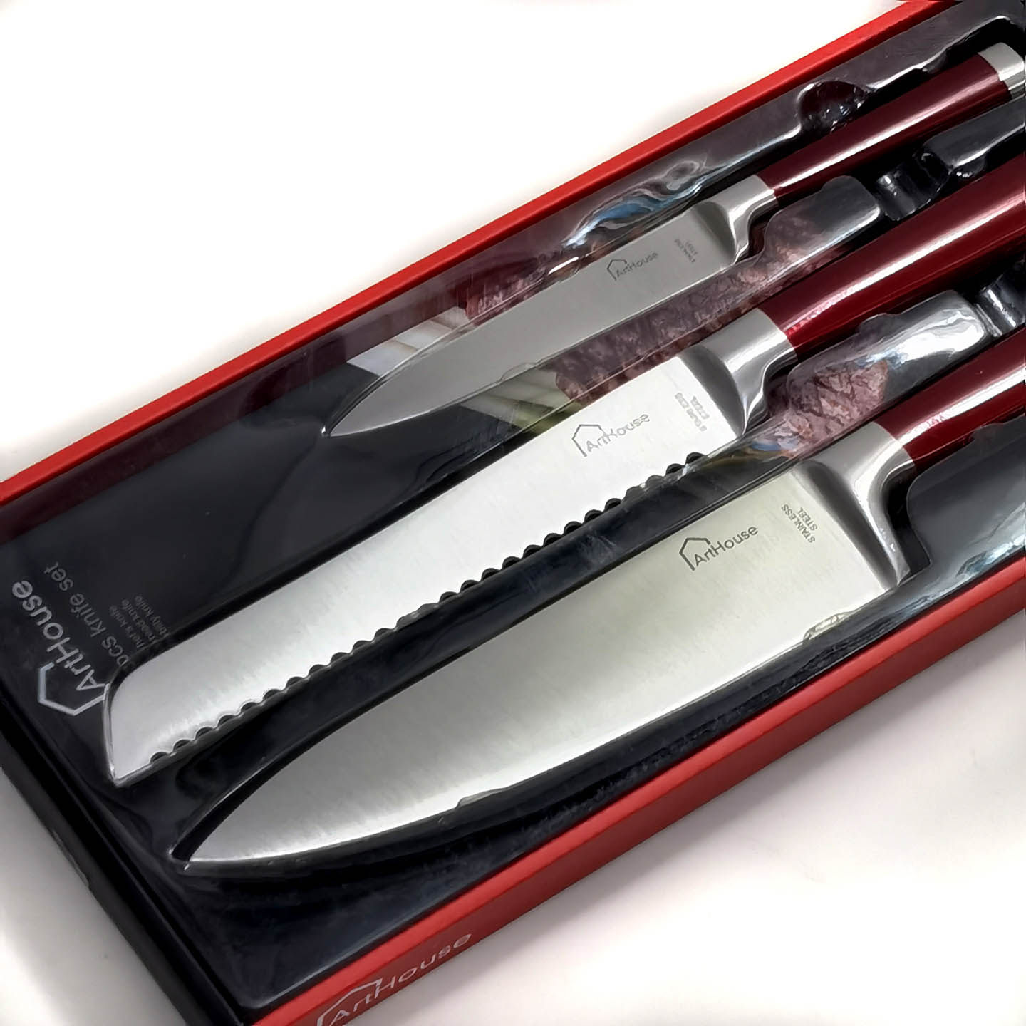 Красная стальная ручка из нержавеющей стали интегрированное западное кухонное нож 3 кусочки шеф -повара.