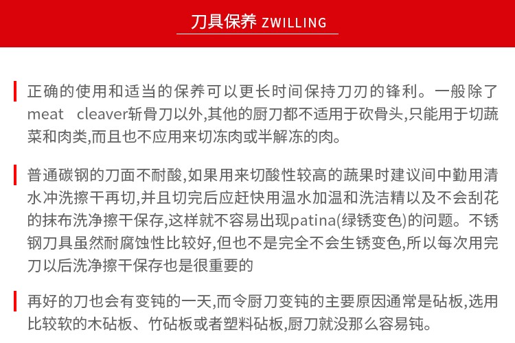 Стоит упомянуть, что материал для ножа Twin 1731 является ценным естественным черным деревом. После антисептической обработки инвертированный V -образный баланс балансированного балансированного дизайна поддержки пальцев делает рукоятку очень удобной.Нож полон прочности, отличной стабильности и коррозионной стойкости, приносящий опыт приготовления профессионального шеф -повара. В то же время•Поддельная коллекция чести.