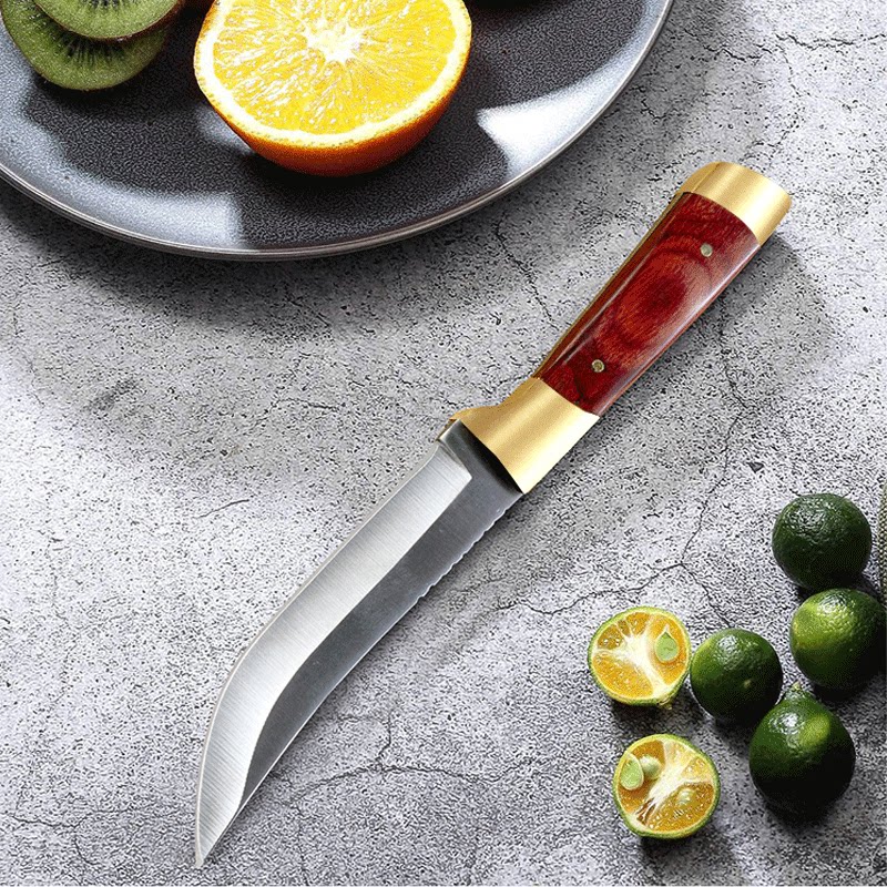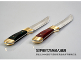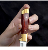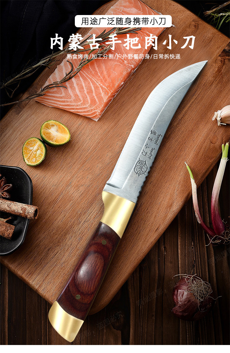 Деревянная ручка ест мясо, монгольскую руку, держащую кухню для мяса, в основном с небольшим ножом для барбекю.