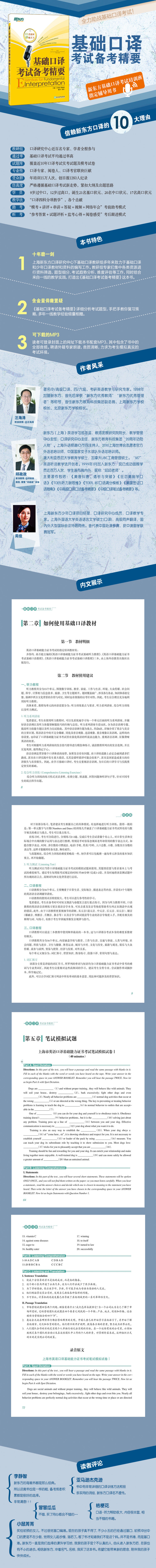 «Основы для базового теста на устный перевод» разделены на четыре части: обзор, письменный тест, пероральный тест и приложение.Резюме резюме представляет собой общую способность теста базовых способностей и использование учебных пособий для большинства кандидатов; Преподавал опыт и навыки объяснения для большинства кандидатов из двух частей: устного и интерпретатора, и сопровождали вопросы теста на имитацию интерпретатора, ссылаются на ответы и прослушивание оригинальных текстов.Приложение после книги Zui - это богатый базовый учебный материал для интерпретации, подготовленный подготовкой автора к кандидатам, включая американские линии фильмов, VOA Special News Sulder Vorcalary, и вы показываете рекомендацию веб -сайта английского обучения.