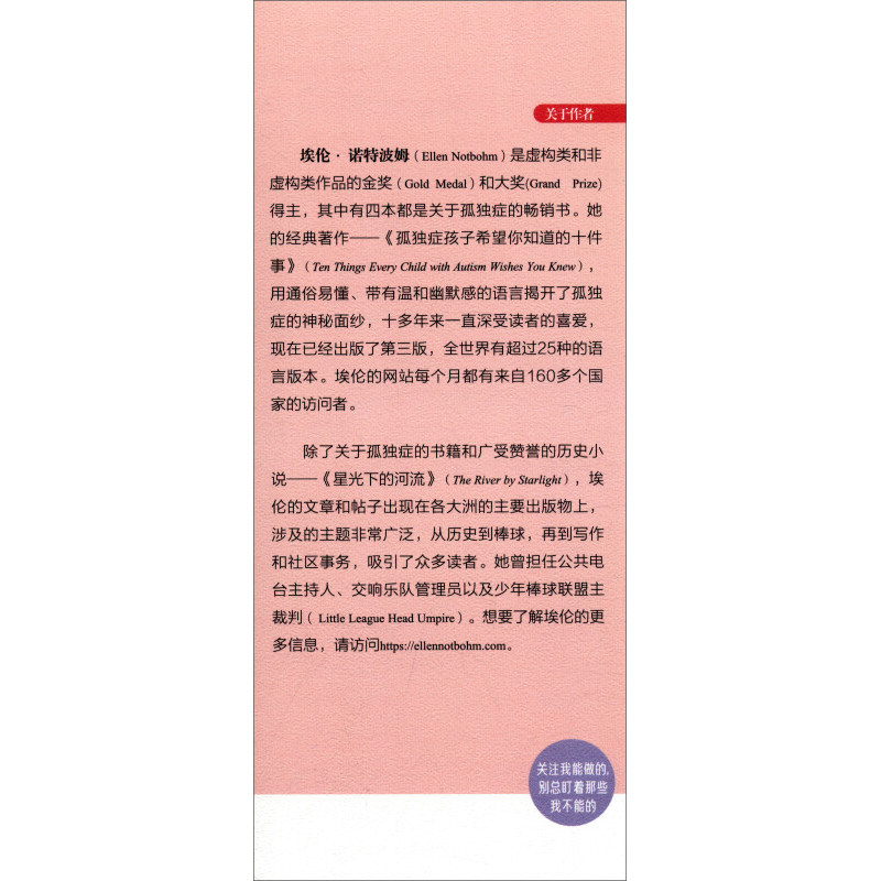 Эллен·Эллен Нотбом, золотая медаль и лауреаты главных призов художественных и некачественных работ, четыре из которых являются лучшими книгами об аутизме.Ее классические произведения - «Десять вещей, которые каждый ребенок с аутизмом хочет, чтобы вы знали», в четком, легком, мягком юмористическом языке, загадочная завеса аутизма показывается, что читатели любили его более десяти лет. был опубликован, и в мире насчитывается более 25 типов языковых версий.На сайте Эллен посетители из более чем 160 стран каждый месяц.В дополнение к книгам по аутизму и высоко оценили исторические романы- «Река от Starlight», статьи и посты Эллен появляются на основных публикациях различных континентов. Это привлекло много читателей.Она работала ведущей общественной радиостанции, администратора симфонической группы и рефери юниорской бейсбольной лиги.Для получения дополнительной информации об Эллен, посетите https://ellennotbohm.com.