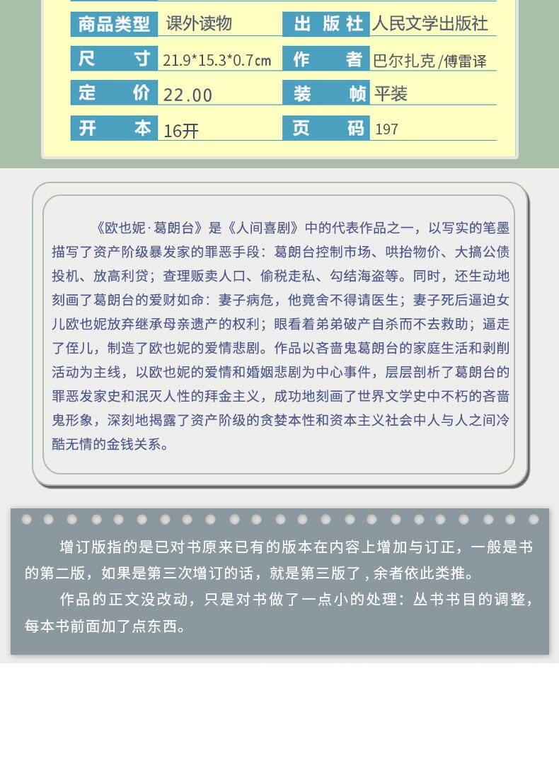 «Евгения» Бальзака в переводе Фу Лея.&Middot;Grandet (классическая устная версия)/Chinese Reading Series» рассказывает историю о деньгах, уничтожающих человечество и вызывающих семейную трагедию. Он вращается вокруг центрального события любовной трагедии Евгении и использует волны, вызванные самодержавием в семье Гранде, открытую и тайную борьбу между банкиром и нотариусом вне семьи, а также любовь Евгении к Чарли.&миддот; Гранде полюбил друг друга, а предательство Чарли и болезненный человеческий опыт — три переплетающиеся сюжетные нити в серии романов.