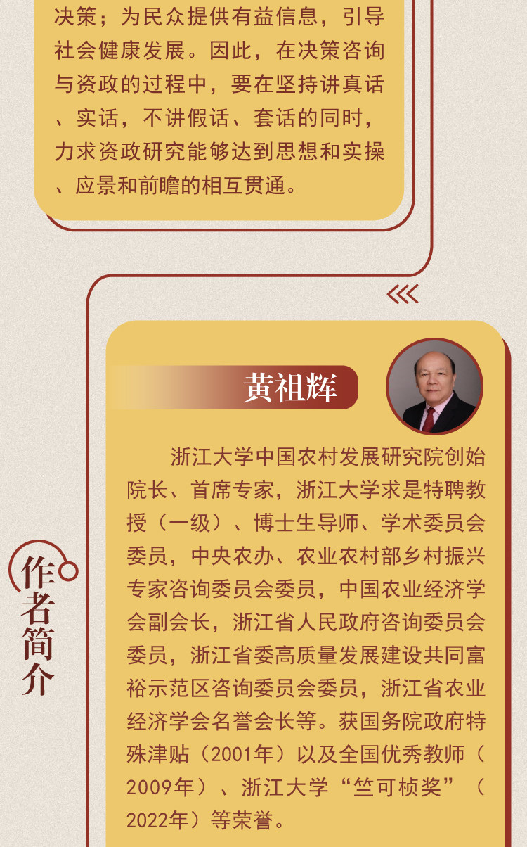 Хуан Зухуй, декан и главный эксперт по научному исследованию сельскому развитию Сельскому развитию Чжэцзян. Строительство, член консалтингового комитета Общего прохождения демонстрационного округа и почетный председатель Сельскохозяйственного экономического общества Чжэцзян.Получил честь специальных пособий Государственного совета (2001) и национальных выдающихся учителей (2009), премии Чжэцзянского университета Чжу Кечэна (2022) и других наград.