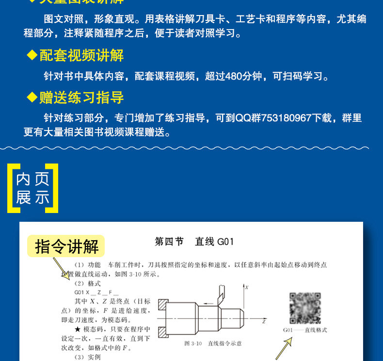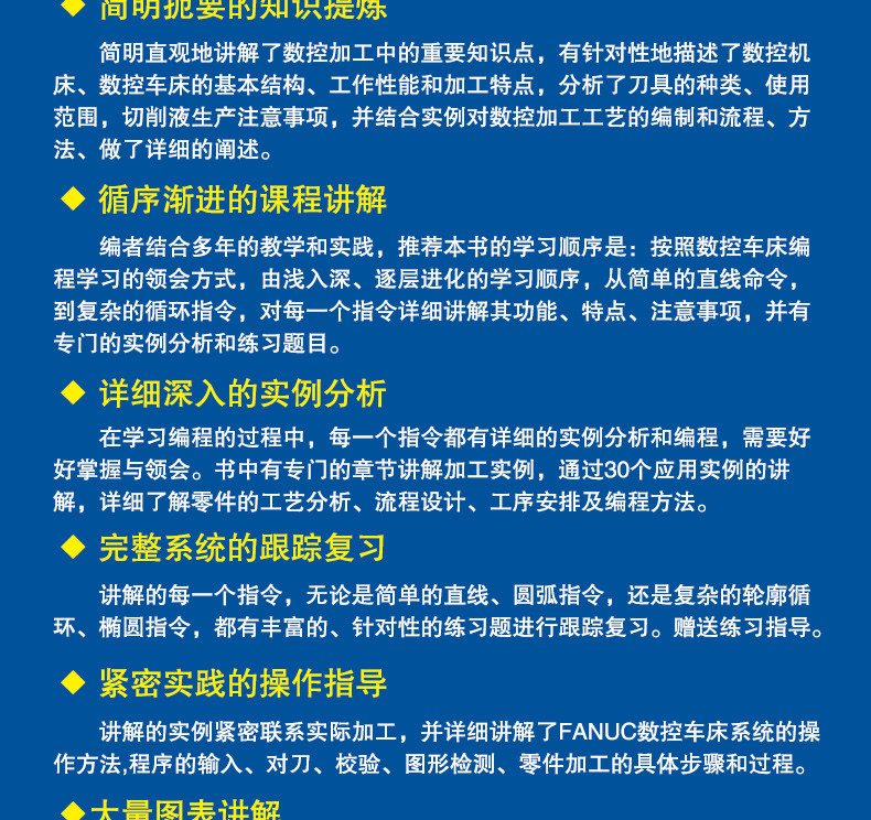 В этой книге преобладает выделение программирования. На основании анализа процесса обработки применяется множество случаев. Она фокусируется на методах работы и идеях программирования общих типов продуктов в производстве предприятий. Подробное объяснение каждого вопроса подробно . +Практикуя метод обучения постепенно изучая инструкции по программированию, и благодаря тщательно выбранным типичным случаям были подробно объяснены программирование и процессы процессов обработки ЧПУ.Что касается удобства обучения, учебное видео с CNC Ratee оснащено учебным видео, читатели могут посмотреть QR -код в книге.Кроме того, практическое руководство в практической части.