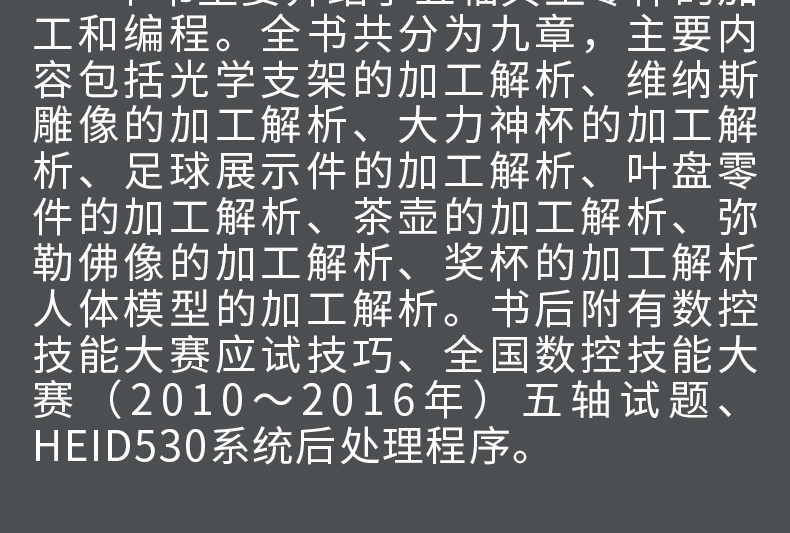 Эта книга в основном знакомит с обработкой и программированием пятиосных типовых деталей.Книга разделена на девять глав. Основное содержание включает в себя анализ обработки оптических кронштейнов, анализ обработки статуи Венеры, анализ обработки Кубка Геркулеса, анализ обработки деталей футбольного дисплея, анализ обработки деталей листового диска, анализ обработки чайника, анализ обработки статуи Будды Майтрейи, анализ обработки трофеев и анализ обработки модели человеческого тела.В конце книги приведены навыки прохождения теста для конкурса навыков работы с ЧПУ, вопросы пятиосного теста для Национального конкурса навыков работы с ЧПУ (2010–2016 гг.) и программа постобработки системы HEID530.