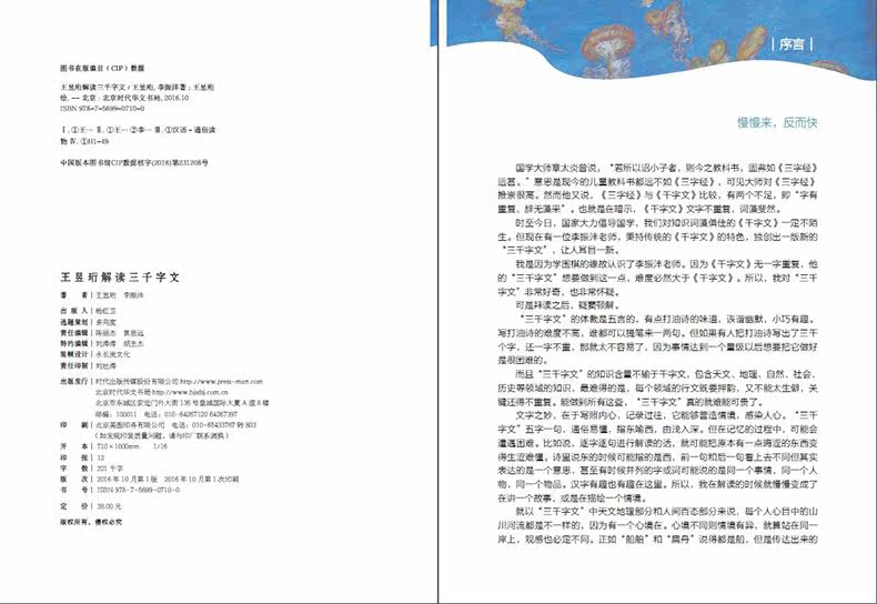 Древний“ тысячи персонажей”, сегодня есть“”. В качестве просветления полный текст повторяется без одного слова. Содержание -всеобъемлющий, охватывающий знание астрономии, географии, природы, общества, истории, культуры, искусства и других аспектов.Текст великолепен, а рифма аккуратная. Эта книга интерпретирует три тысячи слов, объединяя графику и текст, и все иллюстрации из Ван Южэнга.Линии живописи трехмерны и прекрасны; Замечательная интерпретация и реалистичные иллюстрации дополняют друг друга, делая текст рожденным из -за карты, и картина разумная из -за текста. |