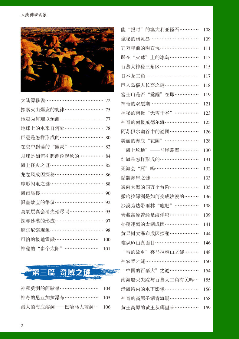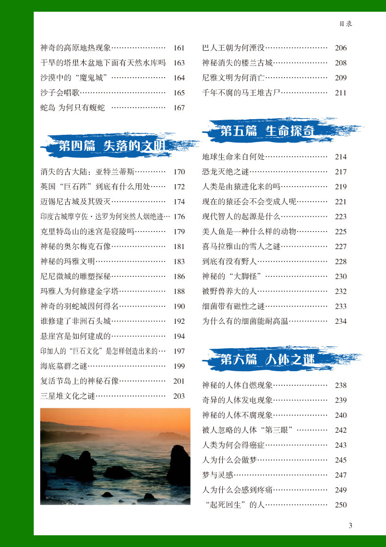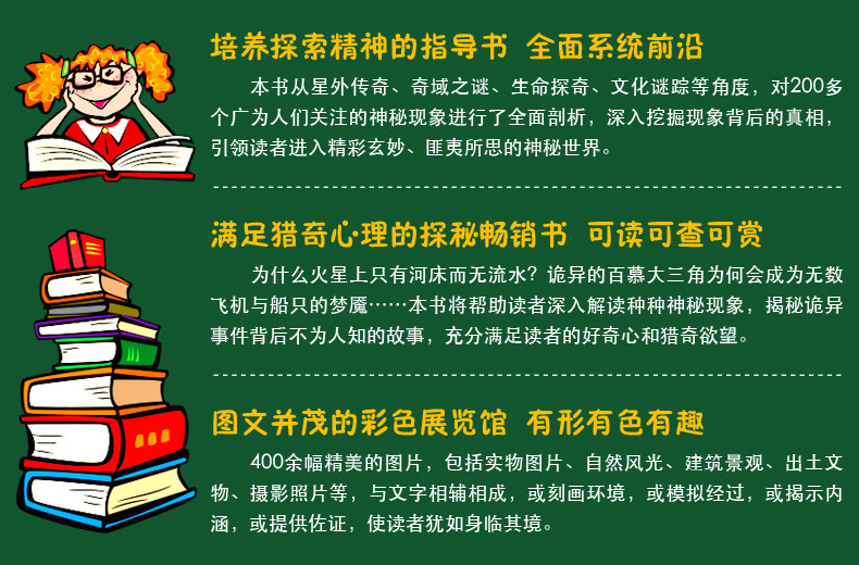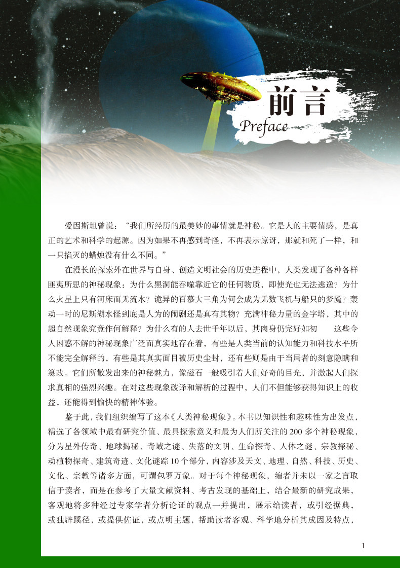 Он объединяет знания, науку и интерес и выбирает более 200 таинственных явлений в различных областях с ценности исследования, значением исследования и более чем 200 таинственными явлениями, на которые люди обращают внимание, чтобы читатели могли легко получить знания и улучшить научную и культурную грамотность Полем