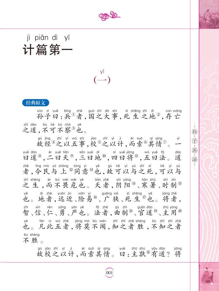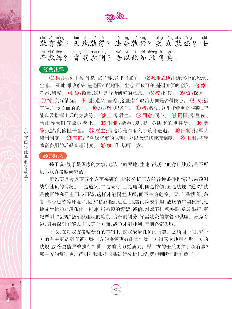 «Искусство войны Сунь-Цзы», также известное как «Сунь-Цзы», «У Сунь-Цзы» и «Искусство войны Сунь-У», является единственной военной книгой в древнем Китае и старейшим из сохранившихся трудов по теории стратегов в мире.Эта книга была создана совместно преподавателями и профессорами университетов. Он полностью представляет полную картину этой классики и принимает“Классический оригинальный текст Классическая аннотация Классический перевод Классический рассказ Классическое расширение”стиль письма,“Классический оригинальный текст”Частичная фонетическая запись, полноцветные иллюстрации, а также крупные и редкие символы не только способствуют самостоятельному чтению учащихся, но и удобны для учителей, помогая учащимся учиться и использовать.