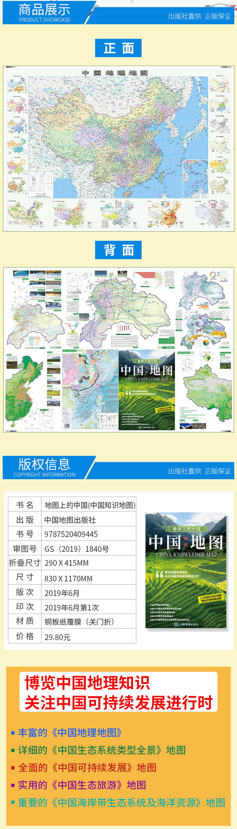 «Китай на карте (карта знаний Китая)» основан на теме географических знаний Китая, подчеркивая выражение природных ресурсов, экологической среды и устойчивого развития.Фронт экологической среды Китая, полная карта китайской прибрежной экосистемы и морских ресурсов, полная карта китайского охвата леса и травы и устойчивое развитие Китая.Опинка включает в себя две части: основная картина и прикрепленная картина. , Полные имена, сокращения, провинциальные столицы (столицы), информация об административном разделении и т. Д. Прилагаемая карта в основном включает в себя все широко используемые карты китайской естественной географии и китайскую человеческую географию, что позволяет читателям более подробно понимать карту о карте ПолемПодарок очень большой -практическая практическая китайская карта диаграмма висящей карты.