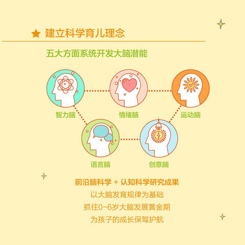 Он основан на характеристиках и законах развития мозга, которые группа ученых и друзей создала новый тип системы образования детей, чтобы суммировать содержание, на которое родители должны обратить внимание в раннем детстве в пять частей: интеллектуальный мозг, эмоциональный Мозг, спортивный мозг, языковой мозг и языковой мозг, а также языковой мозг, а также языковой мозг, а также языковой мозг, а также языковой мозг, а также языковой мозг, а также языковой мозг и языковой мозг и язык мозг.Эти пять мозгов охватывают пять очень важных категорий основных возможностей, таких как основная способность интеллектуального мозга, включают восприятие, внимание памяти, функцию выполнения и решение проблем.Как развивать эти основные способности детей?Мы предоставляем родителям соответствующие методы и предложения для воспитания.