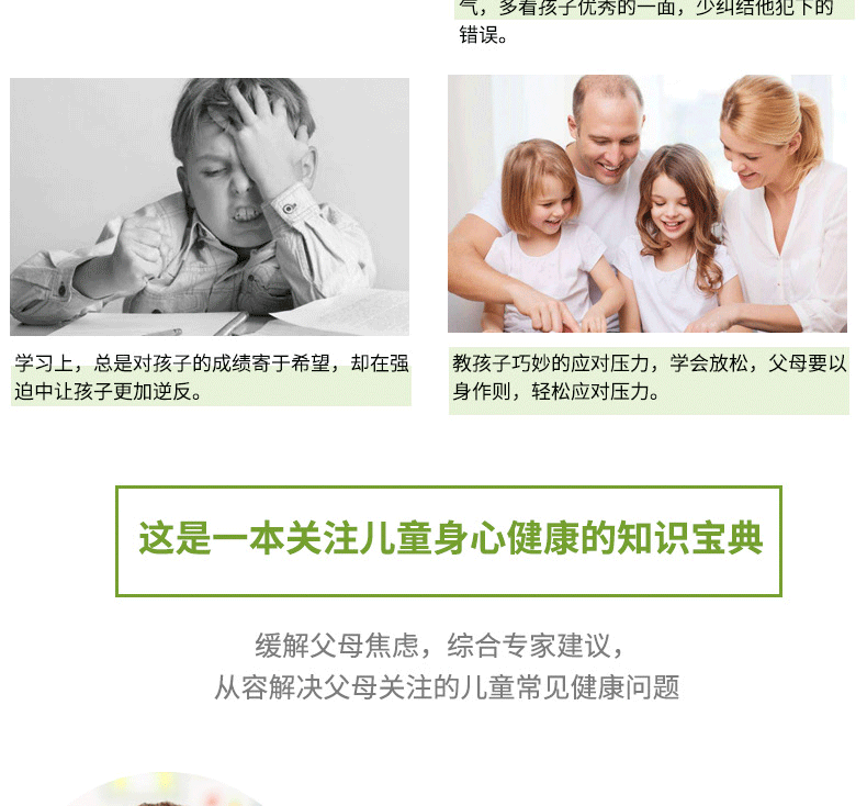 Книга разделена на две главы: выше и следующая: первая часть сосредоточена на здоровье здоровья детей и подробно описывает пищевые привычки, привычки сна, привычки физических упражнений, поведенческие привычки, профилактику заболеваний, гигиена окружающей среды, гигиена питания, предотвращение загрязнения. Источники и другие аспекты. Объяснение; следующая статья посвящена психическому здоровью детей и подробно объясняется из аспектов эмоционального контроля, внешнего стимула, социальных привычек, обучения адаптивности и предотвращения психологических заболеваний.Эта книга направлена на снижение вероятности детей с физическими заболеваниями и психологическими заболеваниями и помочь детям расти здоровым.