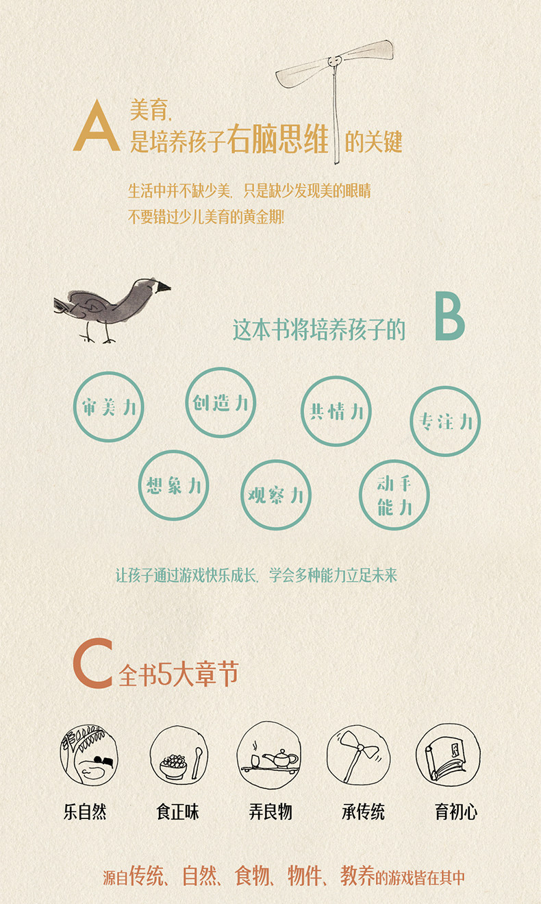 Руководства эстетического воспитания могут быть внедрены и в процесс игры, побуждая детей ценить и чувствовать красоту.В главе «Делаем хорошие вещи» упоминается множество древних и мудрых игрушек. Эти игрушки по-прежнему очень играбельны и эстетичны. Некоторые из них чрезвычайно изысканны по дизайну, а их маленькие тела содержат великую мудрость. Они даже могут стать настоящими версиями для обучения детей дизайну.“Учебник”Полем В «наследственной традиции» восприятие детей и изучение красоты начинается со сцены ритма капли чернил, простирающихся в воде. Красота должна быть испытана, ее можно понять, но трудно выразить. Традиционная культура полна красоты и мудрости. Я готов исследовать эту красоту и надеюсь передать эту красоту своим детям.