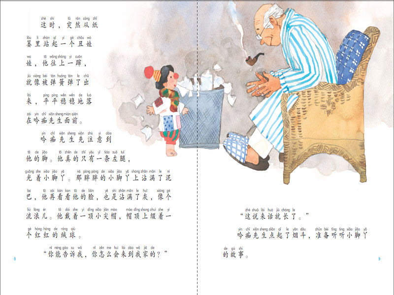 Сначала он заметил свои ноги.У него действительно только одна левая нога, маленькая босая ступня.Толстые ножки были покрыты грязью, а когда он взглянул на свое лицо, оно тоже было покрыто пылью, как у бродячего ребенка.На нем была маленькая остроконечная шляпа с красным помпоном наверху.